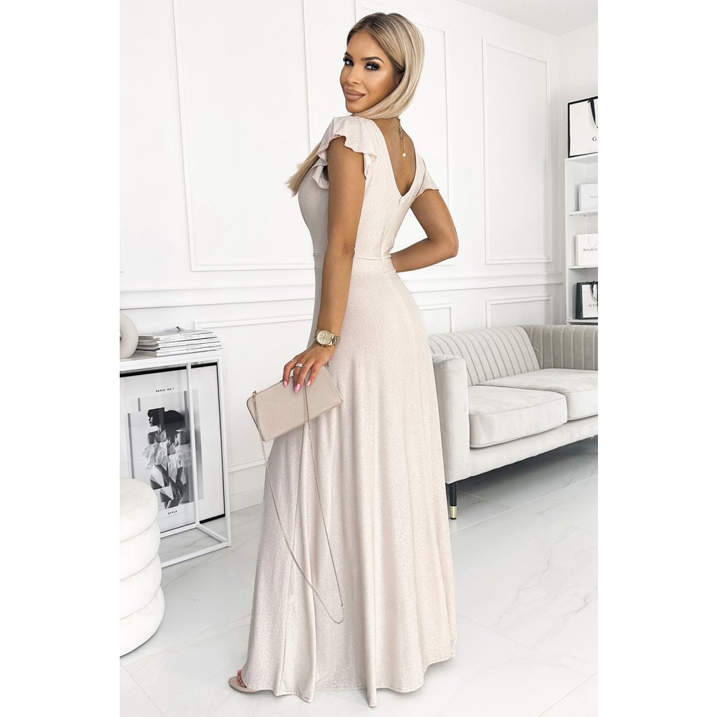 Numoco CRYSTAL třpytivé dlouhé šaty s výstřihem - béžové 411-4