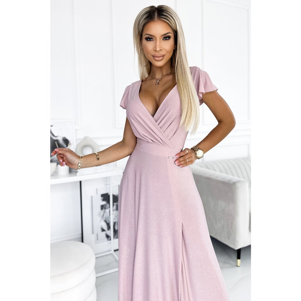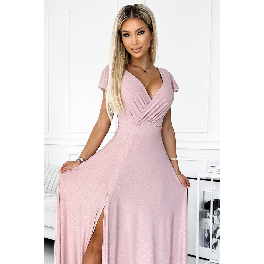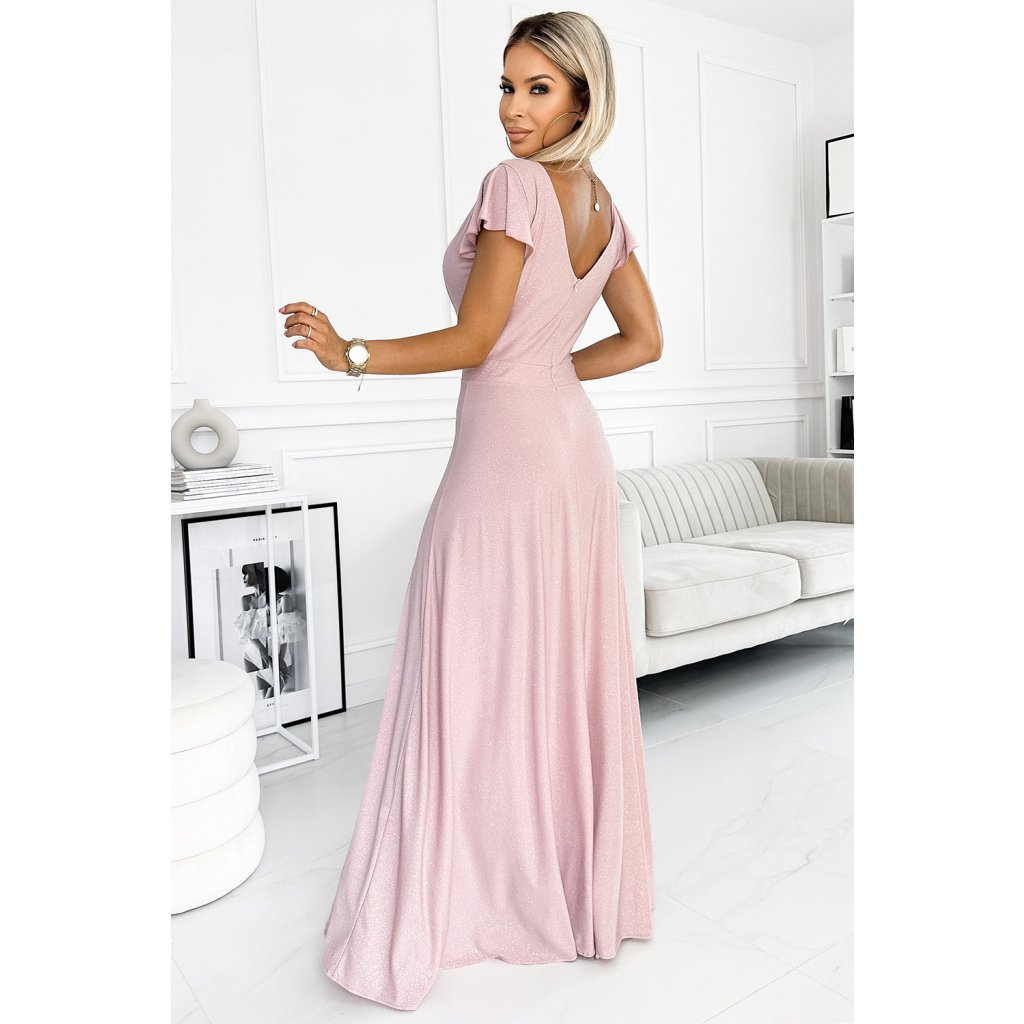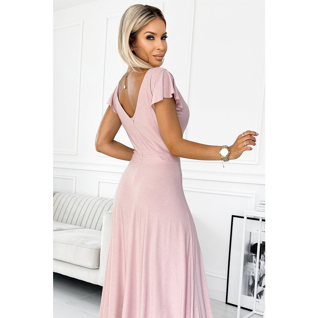 Numoco CRYSTAL třpytivé dlouhé šaty s výstřihem - špinavě růžové 411-6 - výprodej
