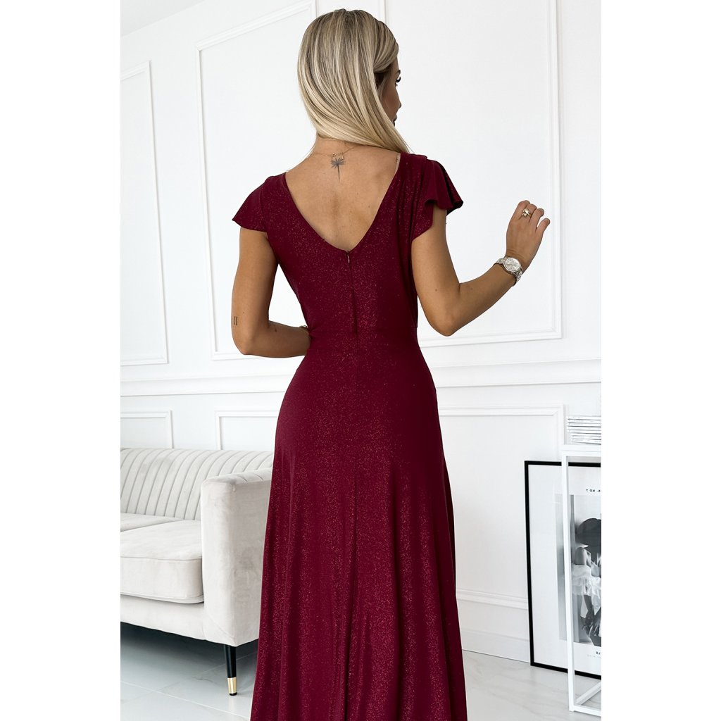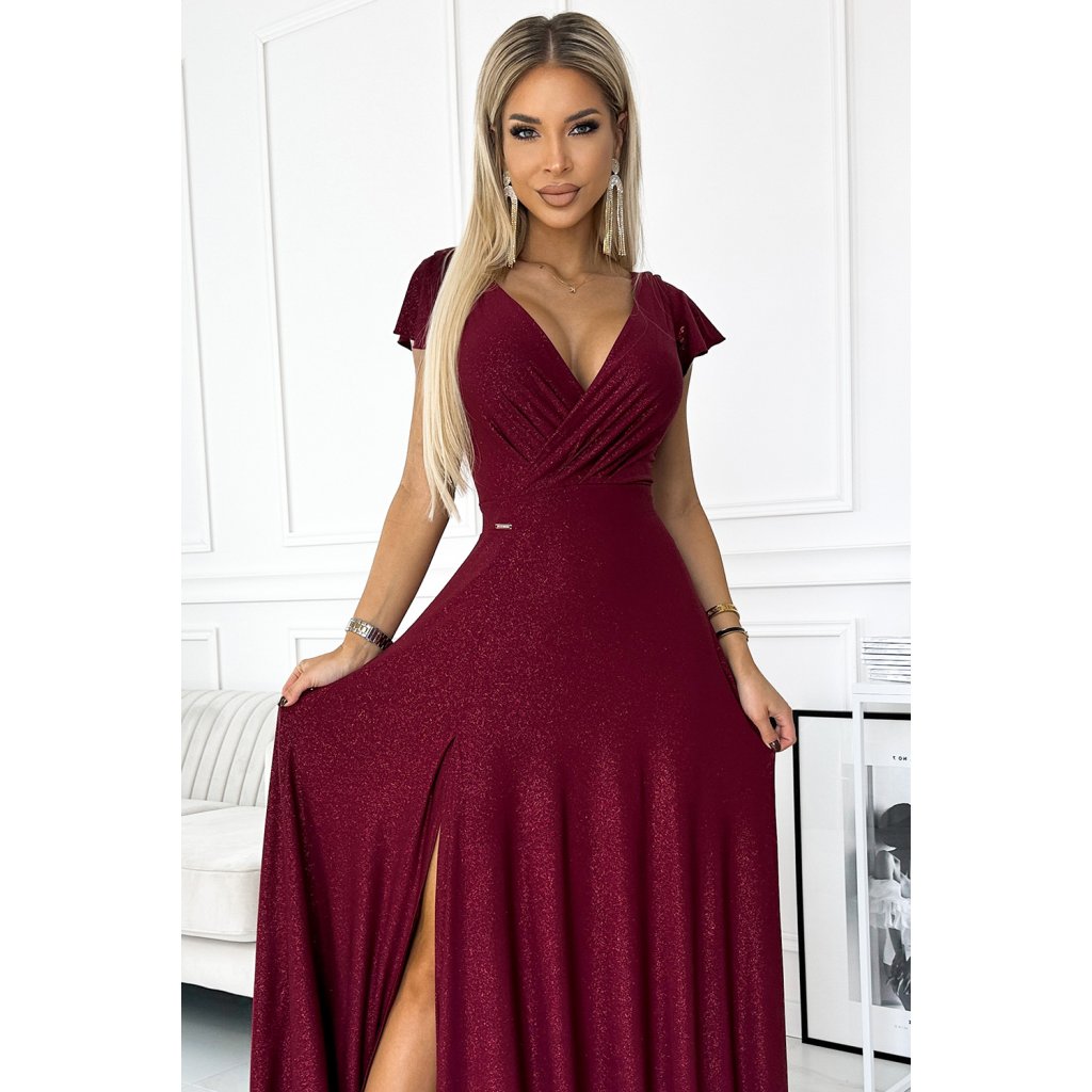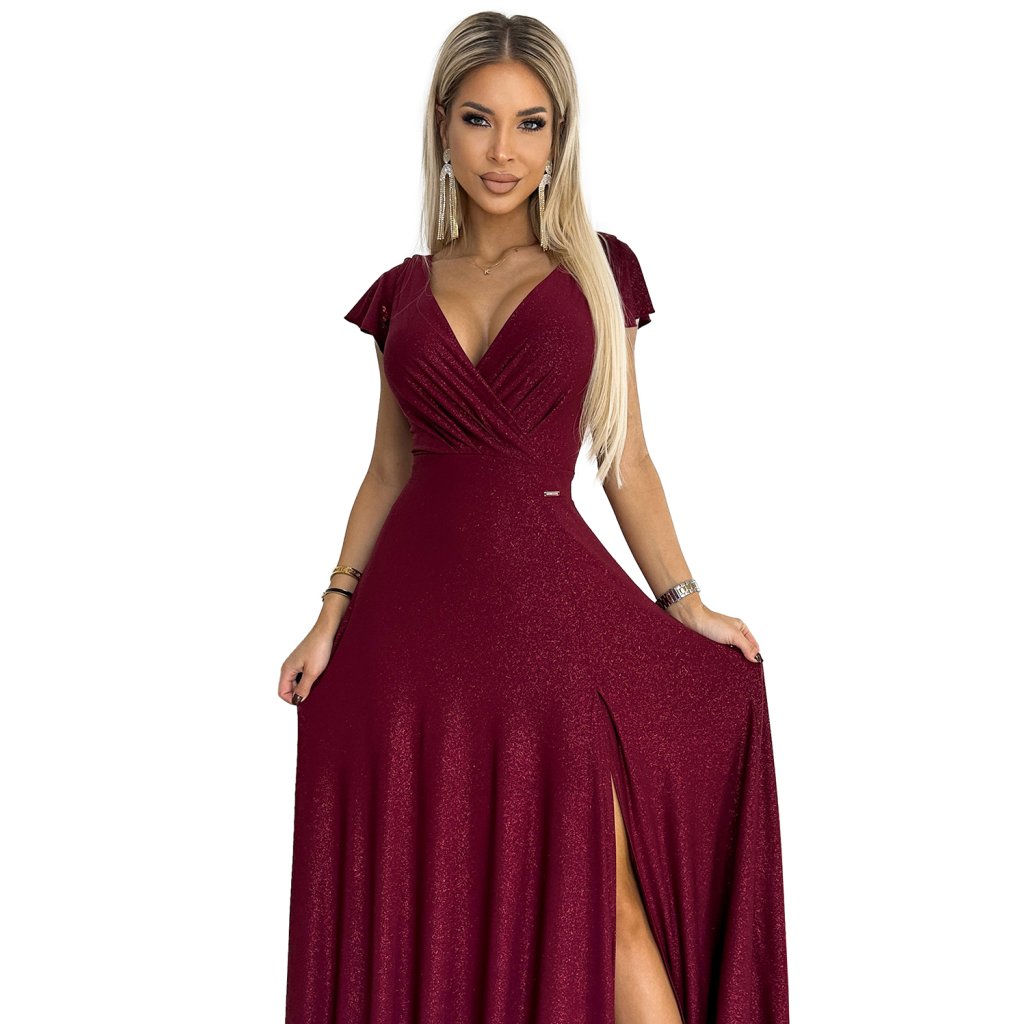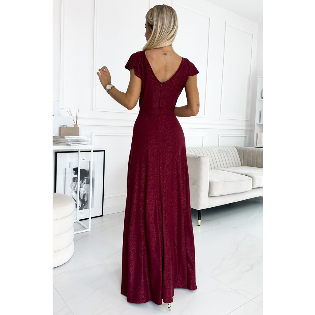 Numoco CRYSTAL třpytivé dlouhé šaty s výstřihem - Vínová barva 411-8