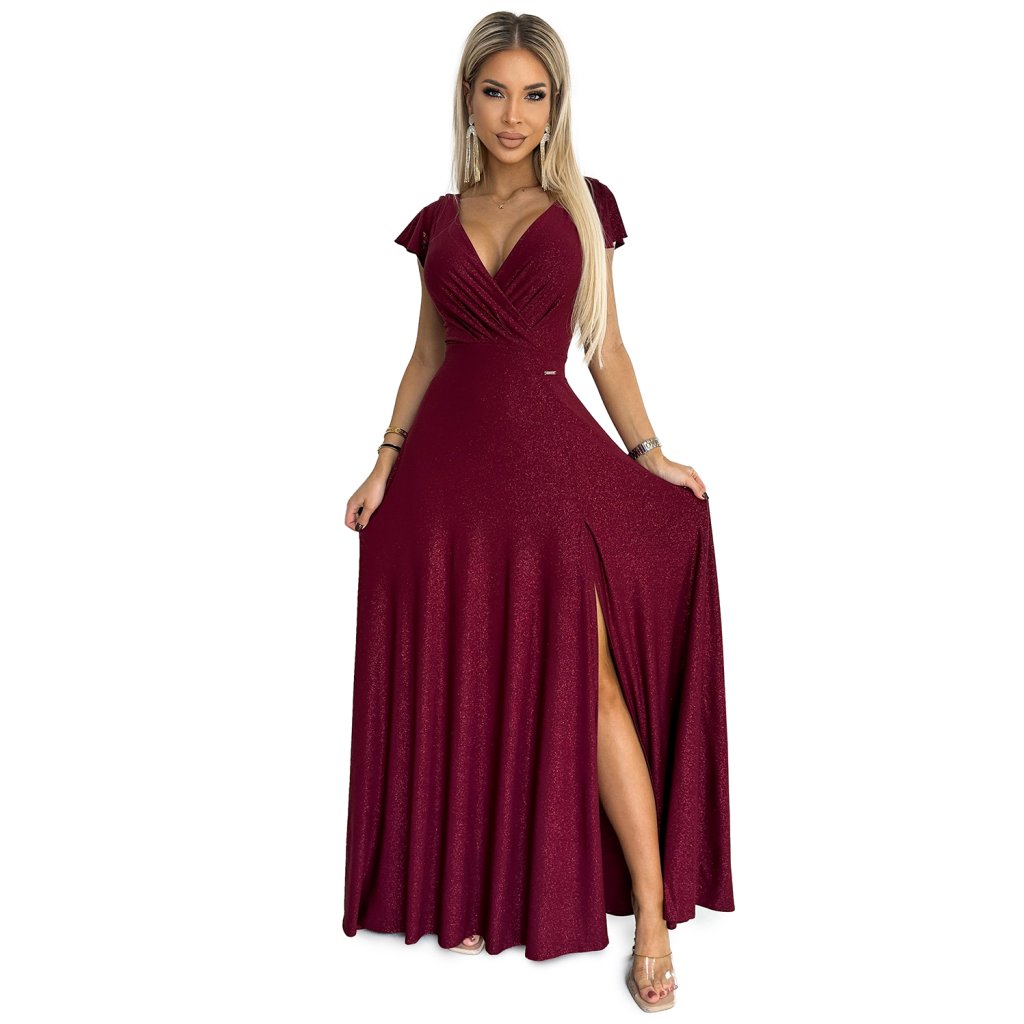 CRYSTAL dlouhé lesklé maxi šaty s psaníčkovým výstřihem a rozparkem na nohavici. Barva: vínová se třpytkami. Šaty krásně odhalují dekolt a jsou skvělé pro tanec. Zapínání zpět na zip. Polský výrobek. Značka Numoco.