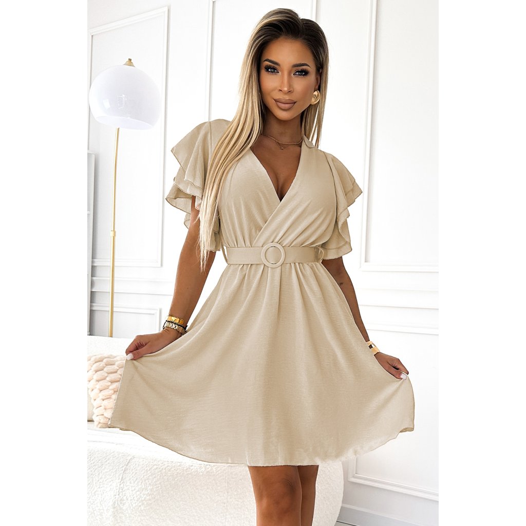 Numoco Dámské šaty s psaníčkovým výstřihem, rukávy a páskem - béžové 586-1
