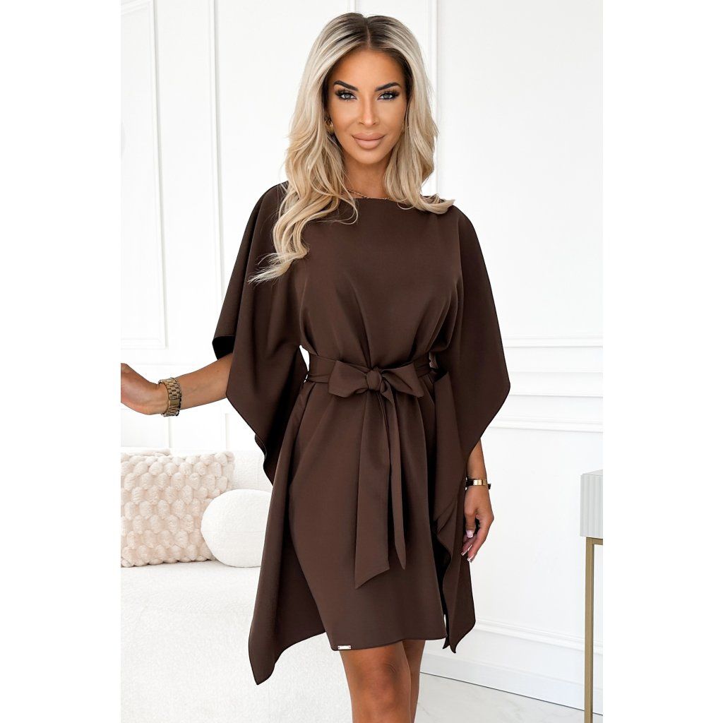 Sofia jsou motýlkové šaty v módní čokoládové barvě. Volný, vzdušný střih zajišťuje pohodlí a volnost pohybu a připojený pásek umožňuje zvýraznit pas a přidat proporce k postavě. Vyrobeno z materiálu příjemného na dotek, zajišťuje pohodlí při nošení. Polská výroba značky Numoco zaručuje vysokou kvalitu zpracování a smysl pro detail. Je perfektní volbou jak pro každodenní nošení, tak pro elegantnější příležitosti.
