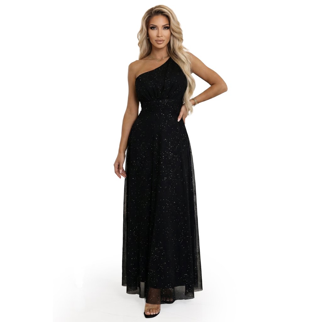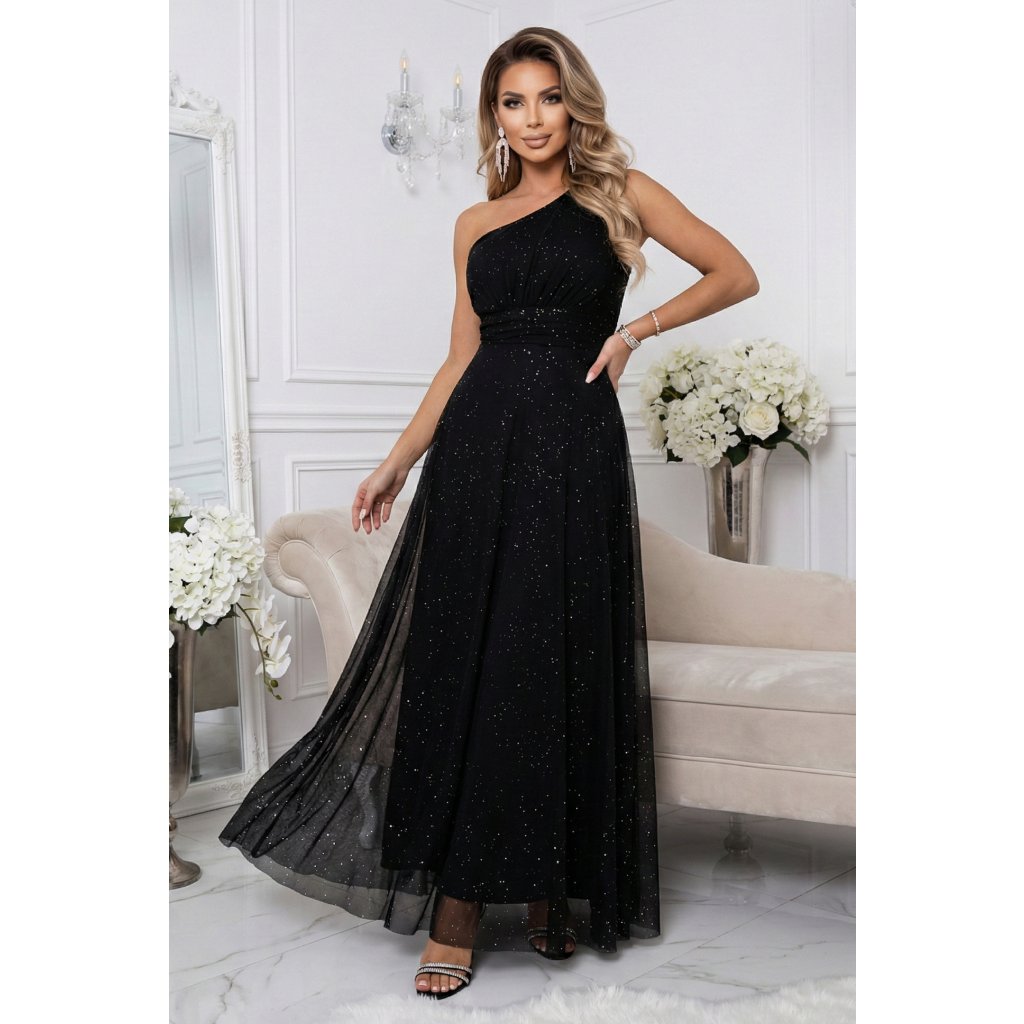 Černé maxi šaty s třpytivým leskem na jedno rameno - Numoco Basic