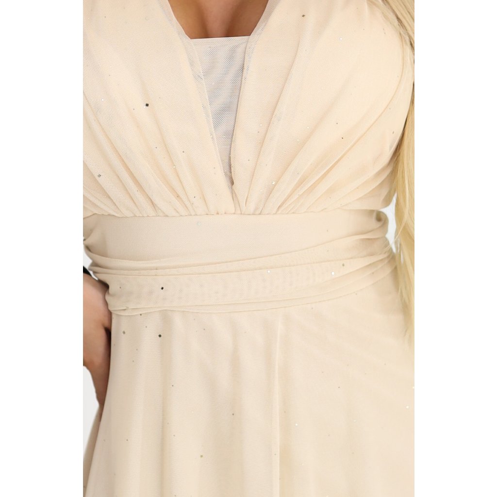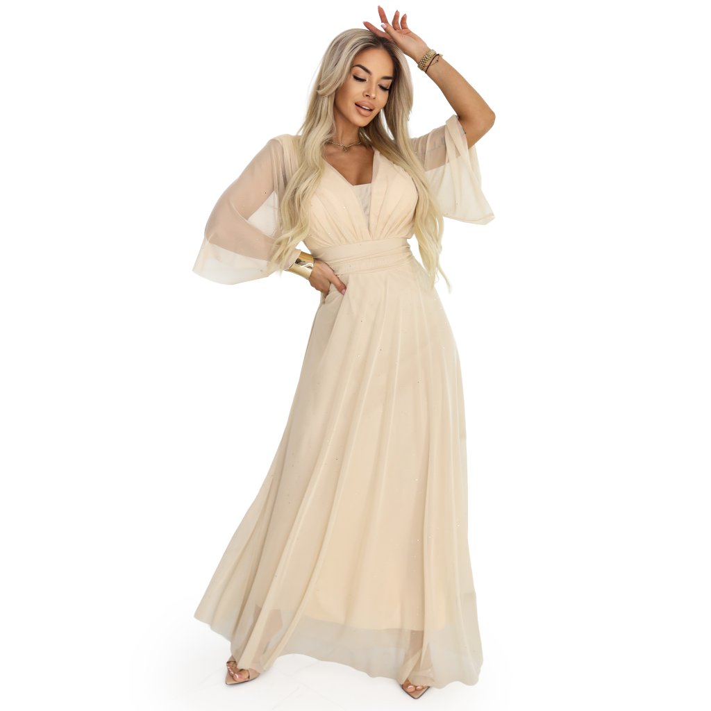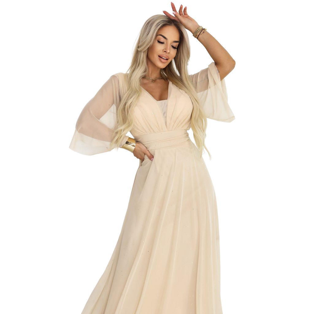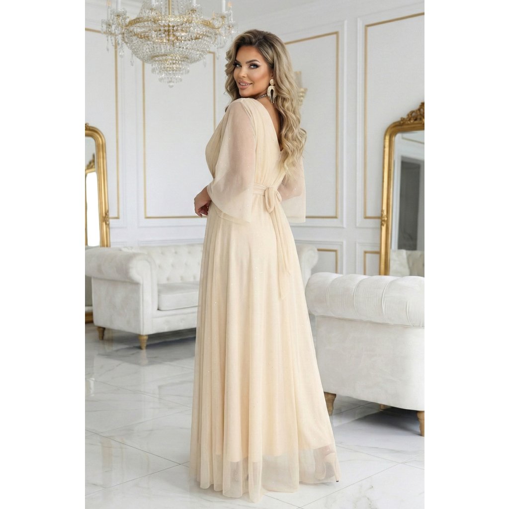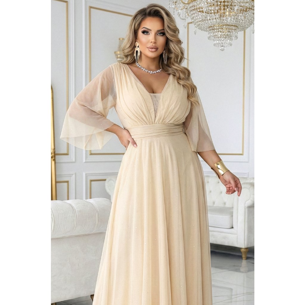 Numoco Dlouhé, třpytivé šaty plus size s kulatým výstřihem a průsvitnými rukávy - šampaňsky béžové 654-2