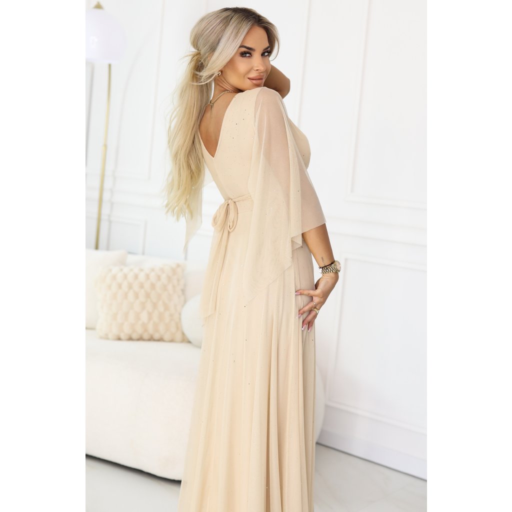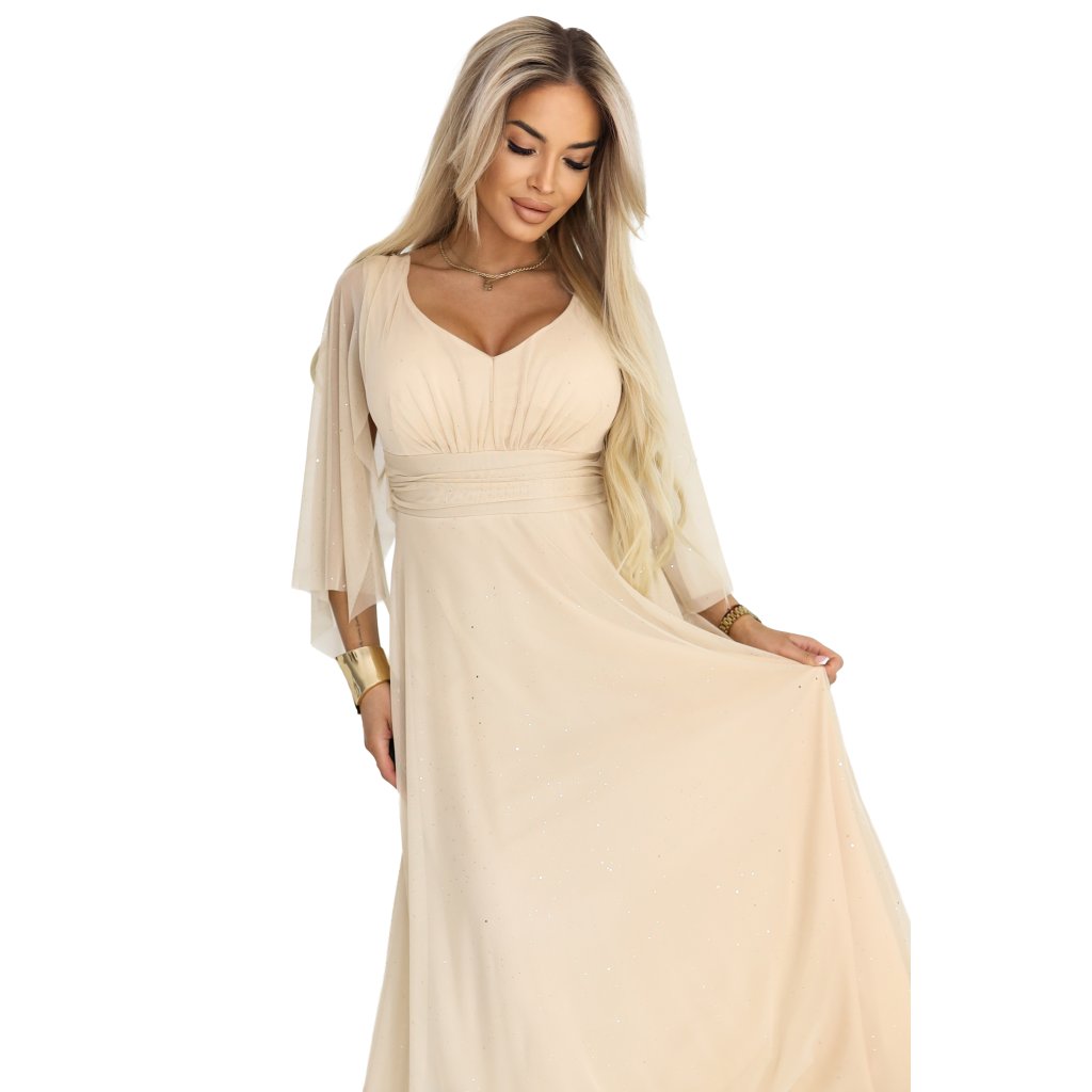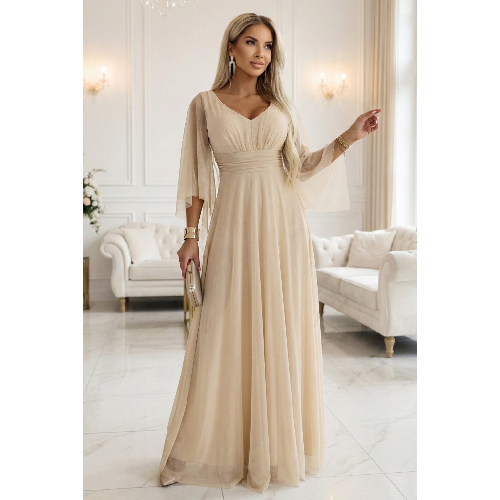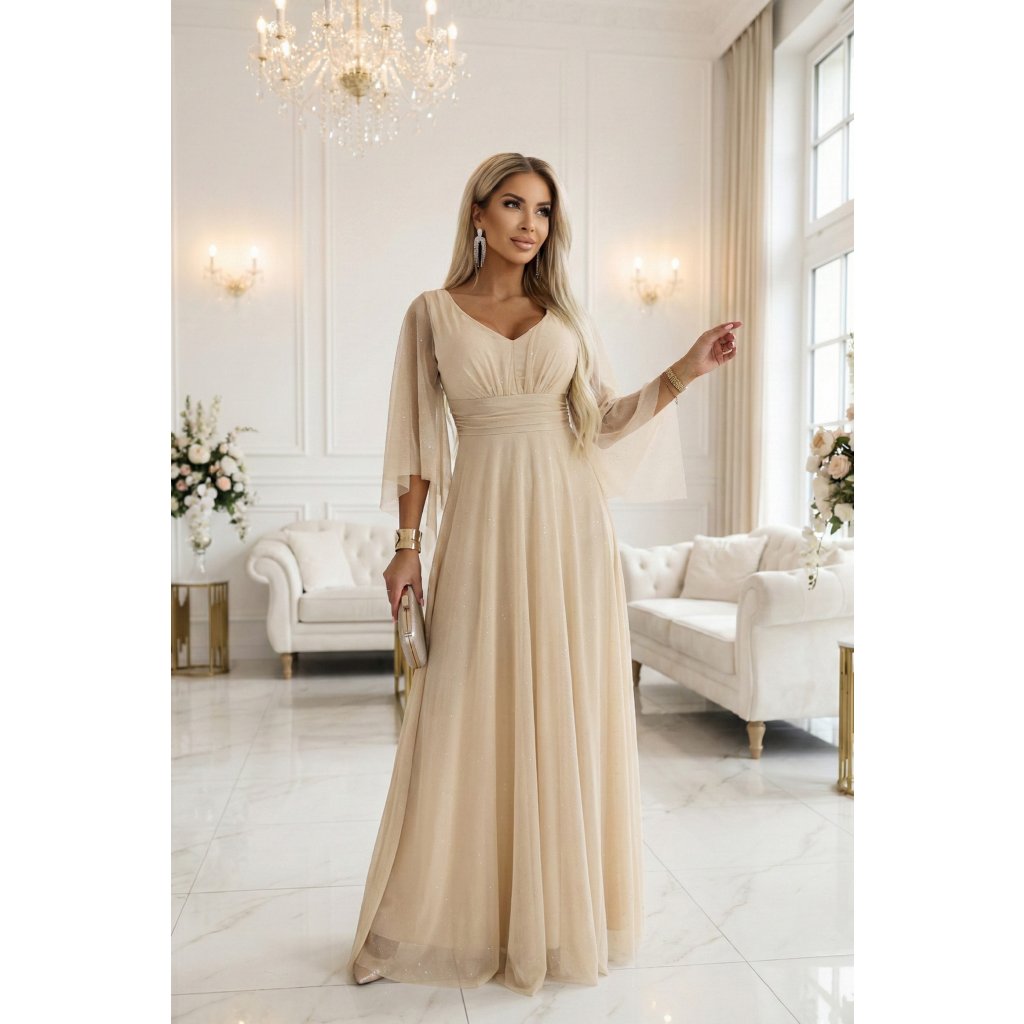 Numoco Dlouhé, třpytivé šaty s hlubokým výstřihem a průsvitnými rukávy - šampaňsky béžové 655-4
