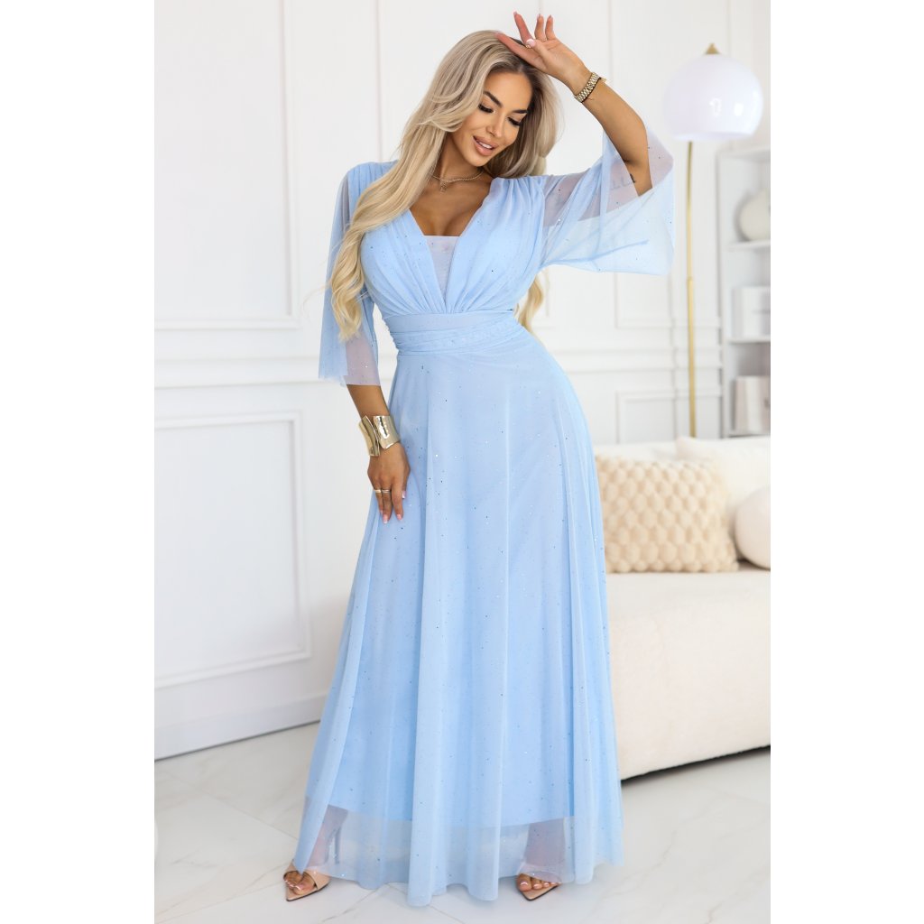 Numoco Dlouhé lesklé šaty plus size s výstřihem a průhledným rukávkem - světle modrá 654-3