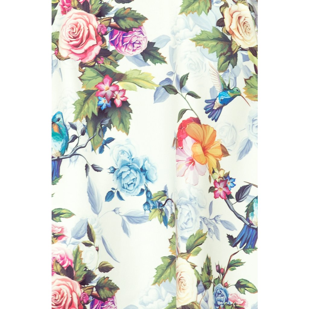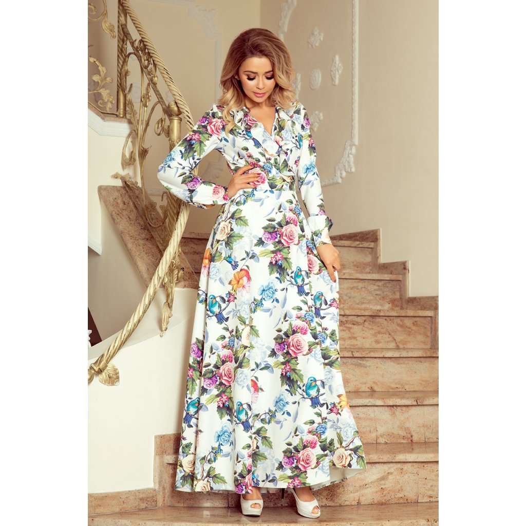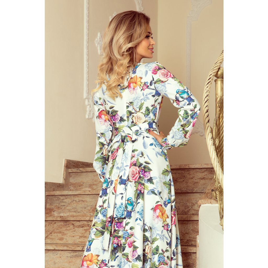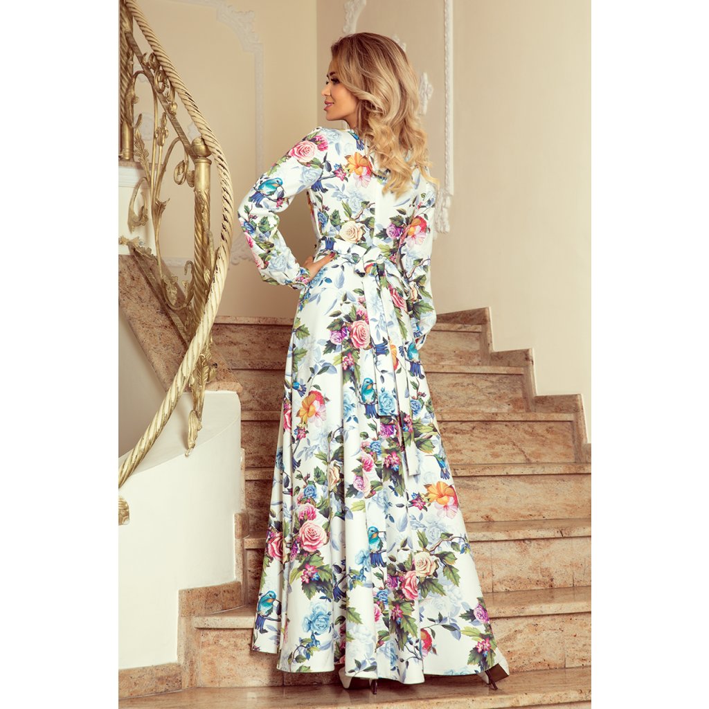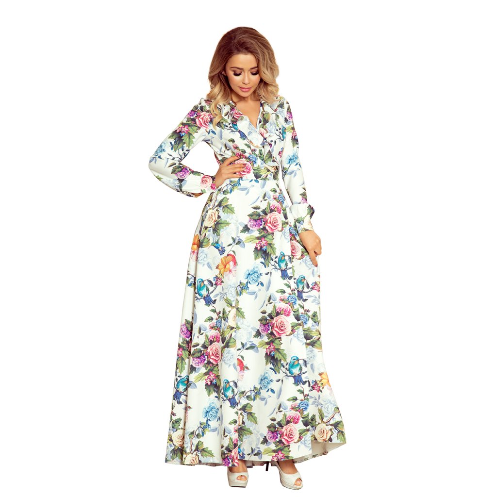 Numoco Dlouhé šaty s volánkem a výstřihem - barevné růže a modré ptáky 245-1