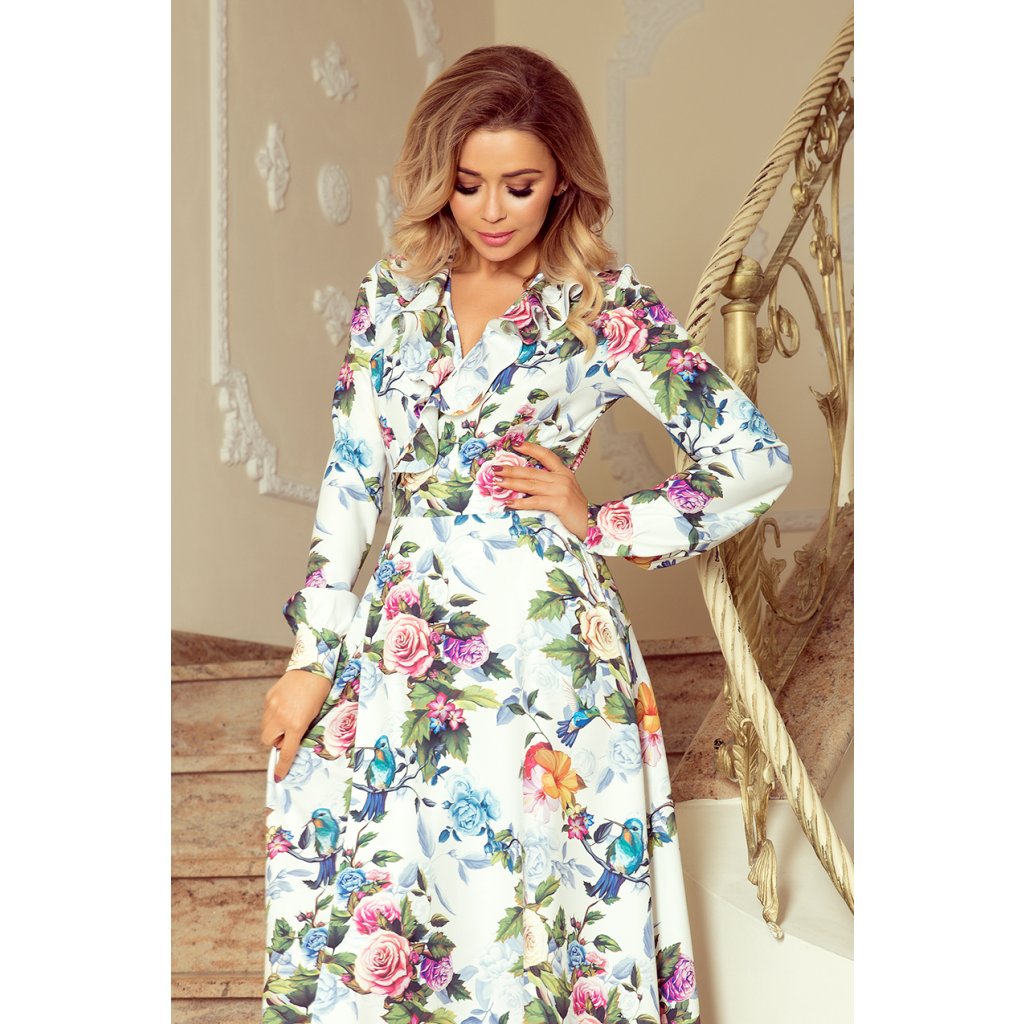 Dlouhé šaty s výstřihem, volánky a dlouhými rukávy. Vyrobeno z příjemného materiálu s barevnými růžemi a modrými ptáky. Značka numoco. Produkce Polsko.