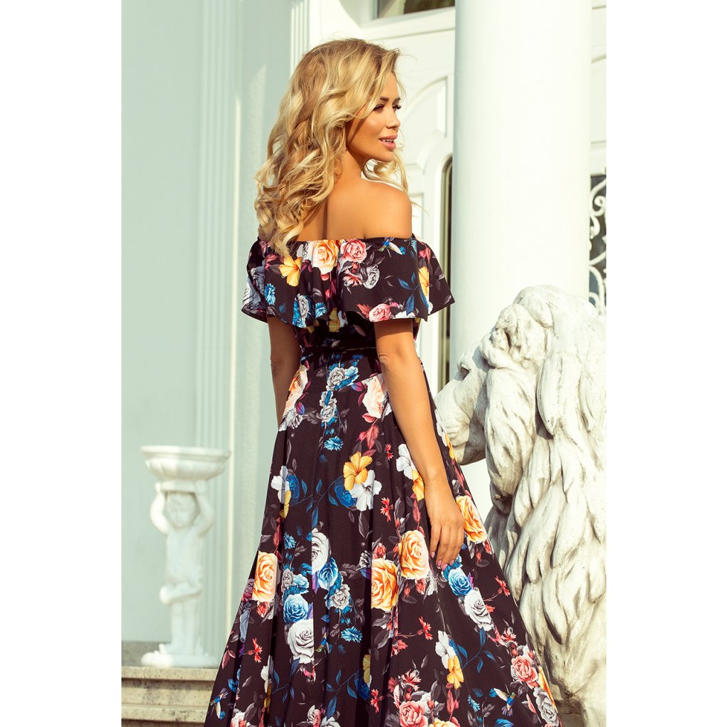 Numoco Dlouhé šaty s volánky - černá + barevné květiny 194-3