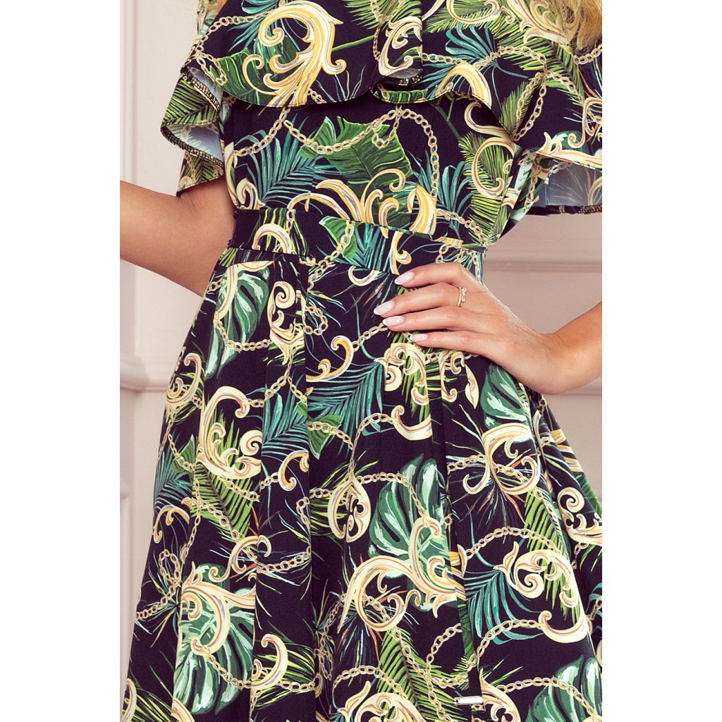 Numoco Dlouhé šaty s volánky - zelené listy a zlaté řetězy 194-4