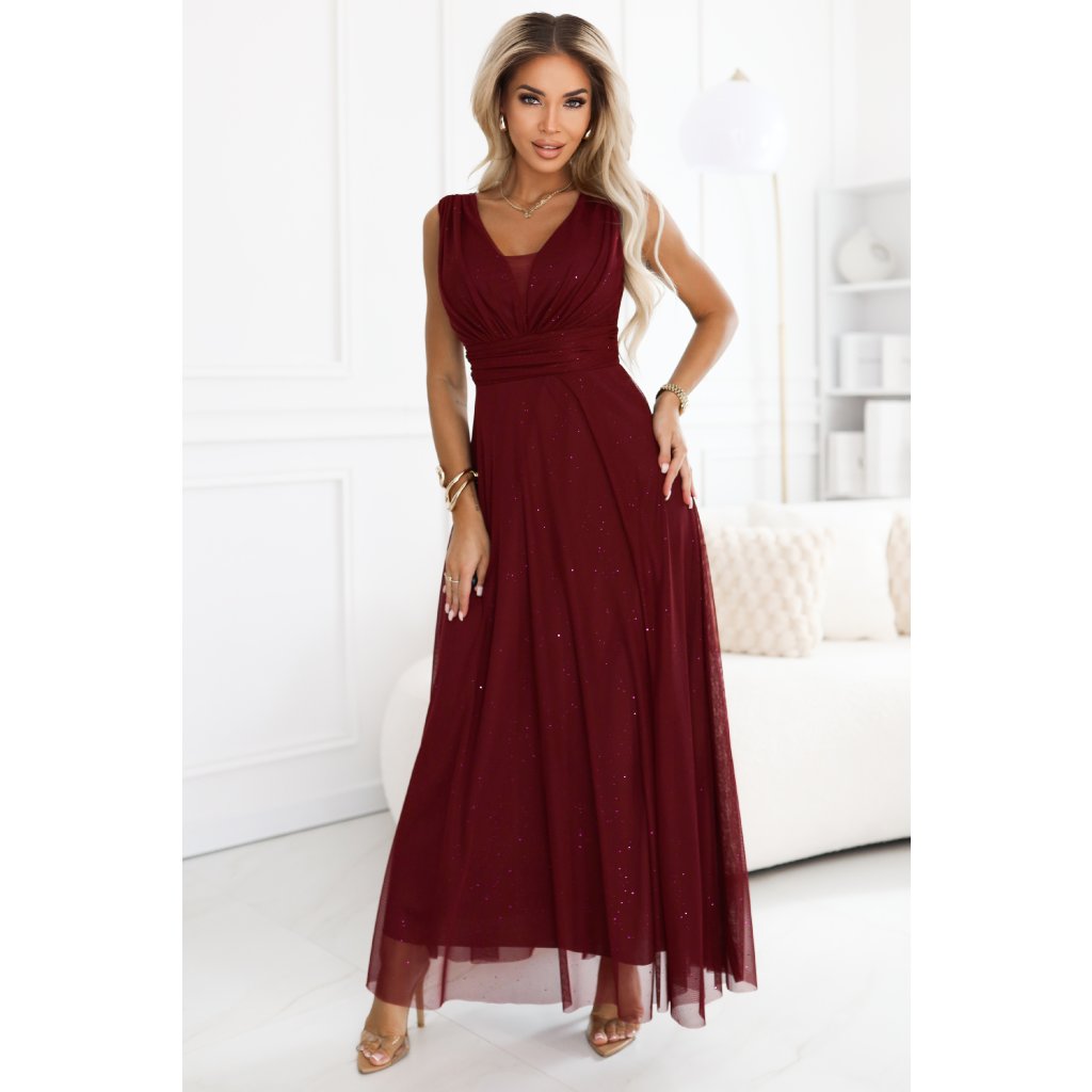 Elegantní dlouhé večerní šaty Basic od Numoco se vyznačují výstřihem do V a jemným leskem. Jsou vyrobeny z pružné vínové látky, krásně lichotí postavě a zajišťují pohodlí.