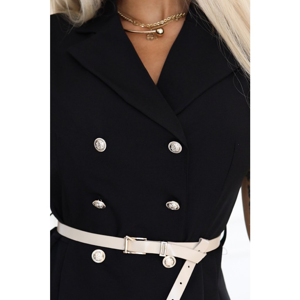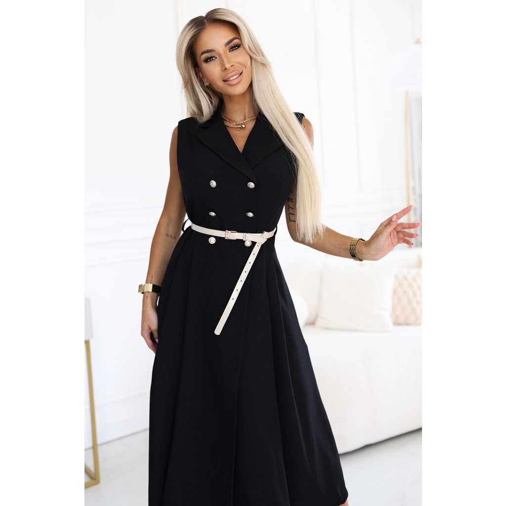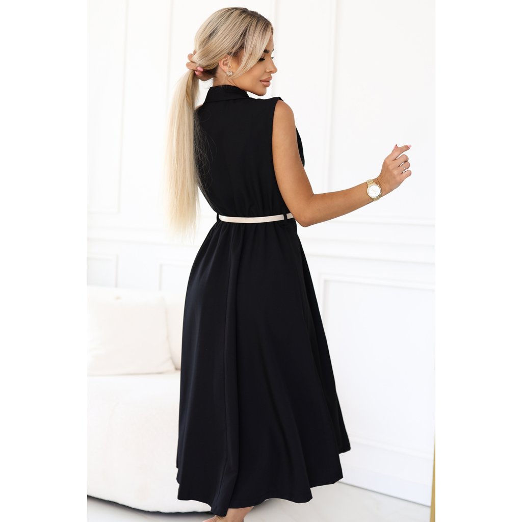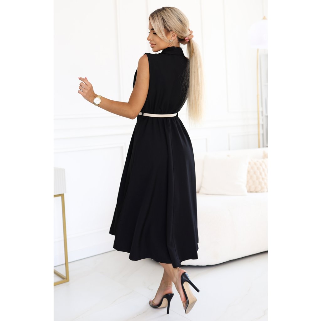 Numoco Elegantní midi košilové šaty se zlatými knoflíky a páskem - černé 596-3