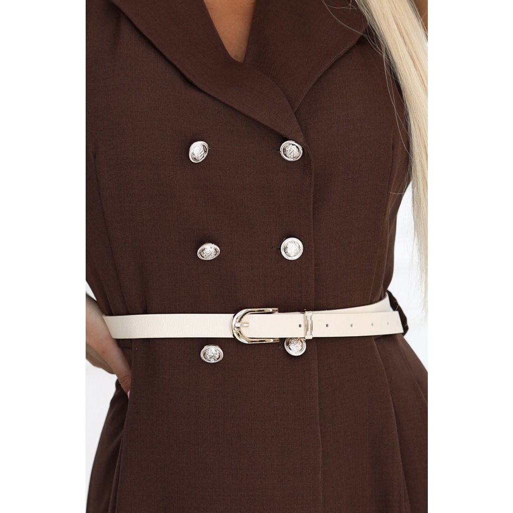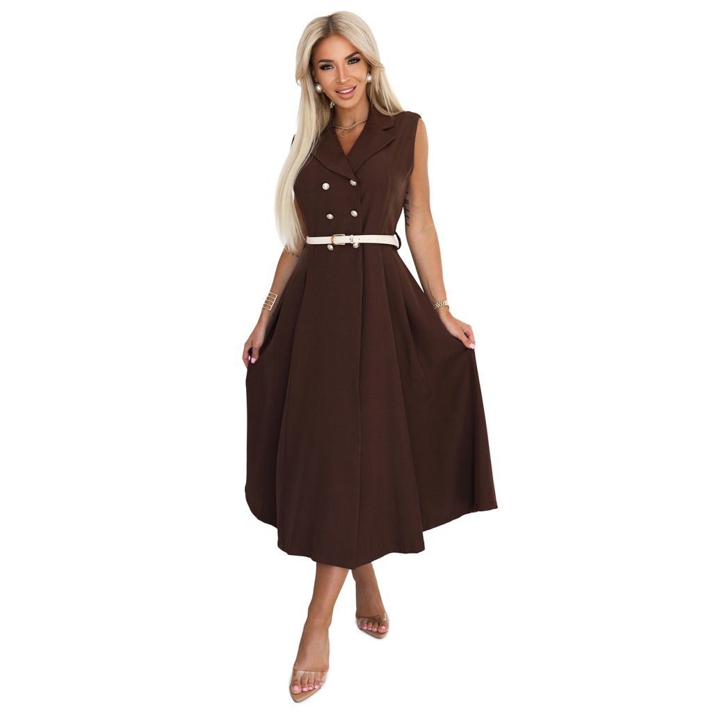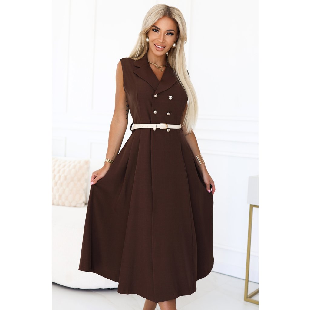 Numoco Elegantní midi košilové šaty se zlatými knoflíky a páskem - čokoládová 596-4