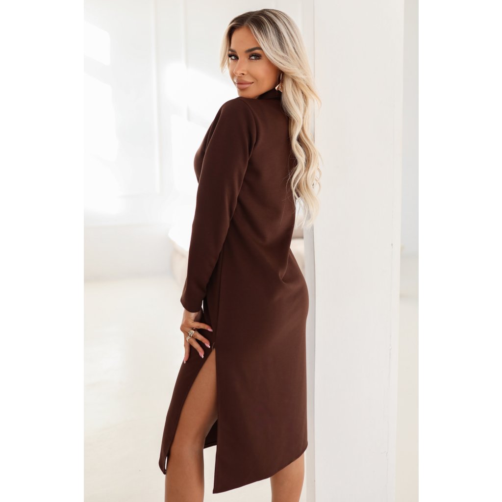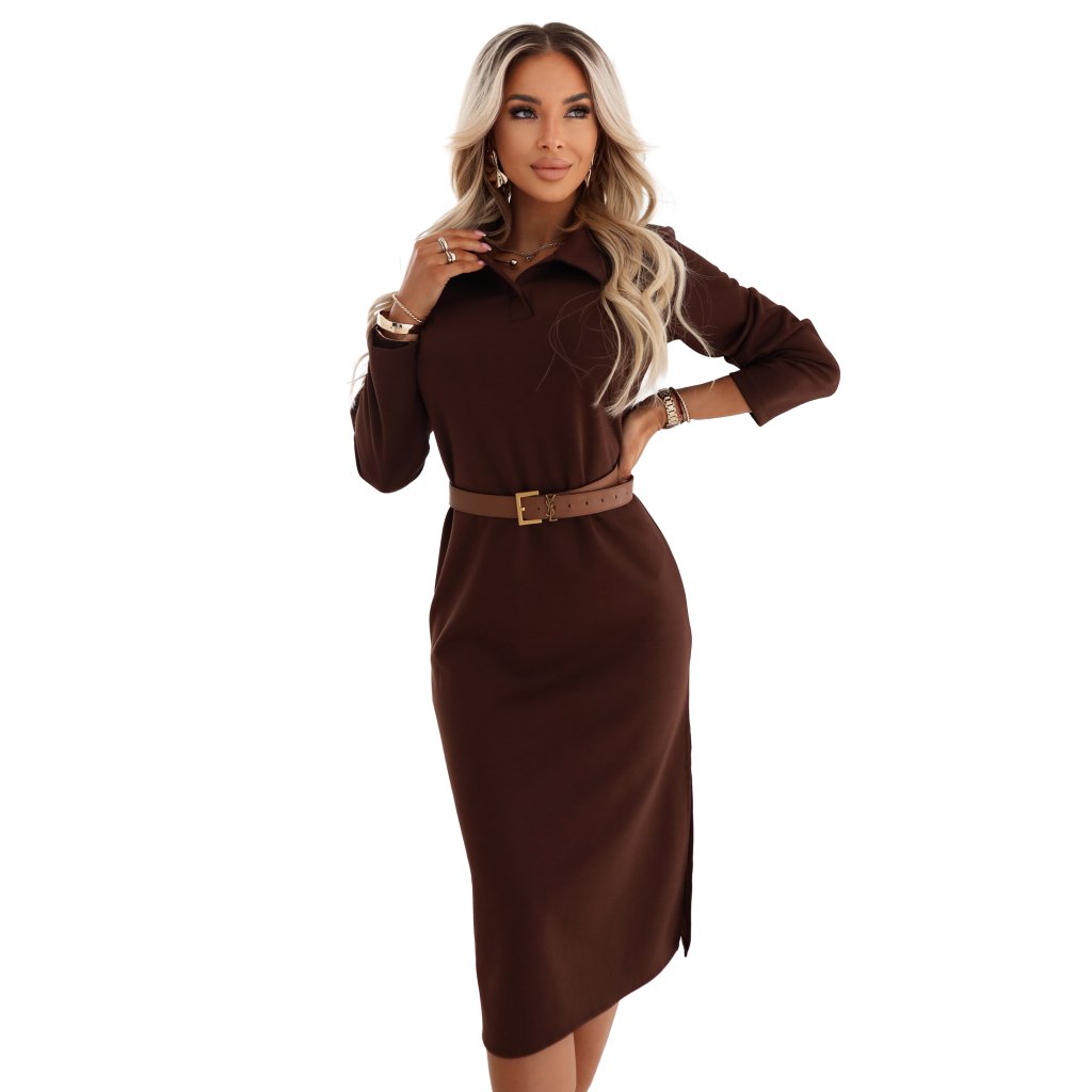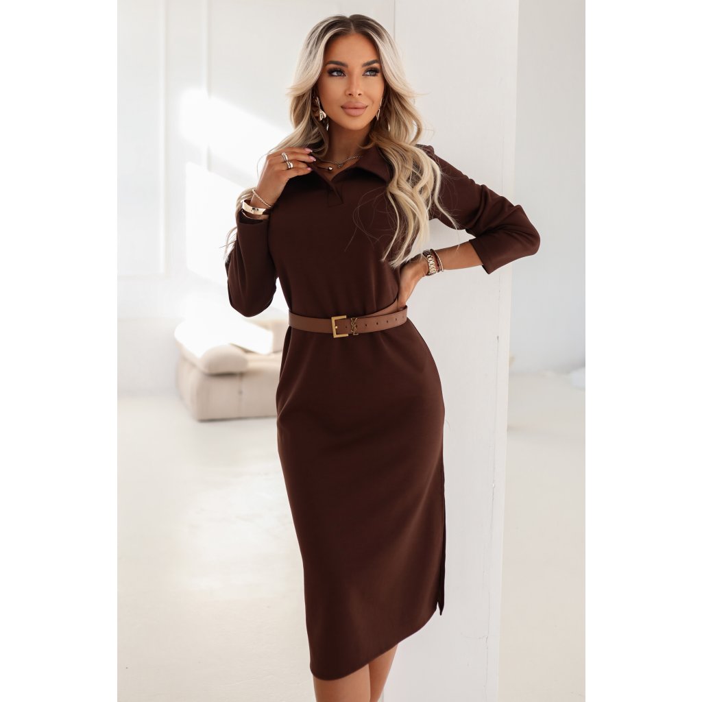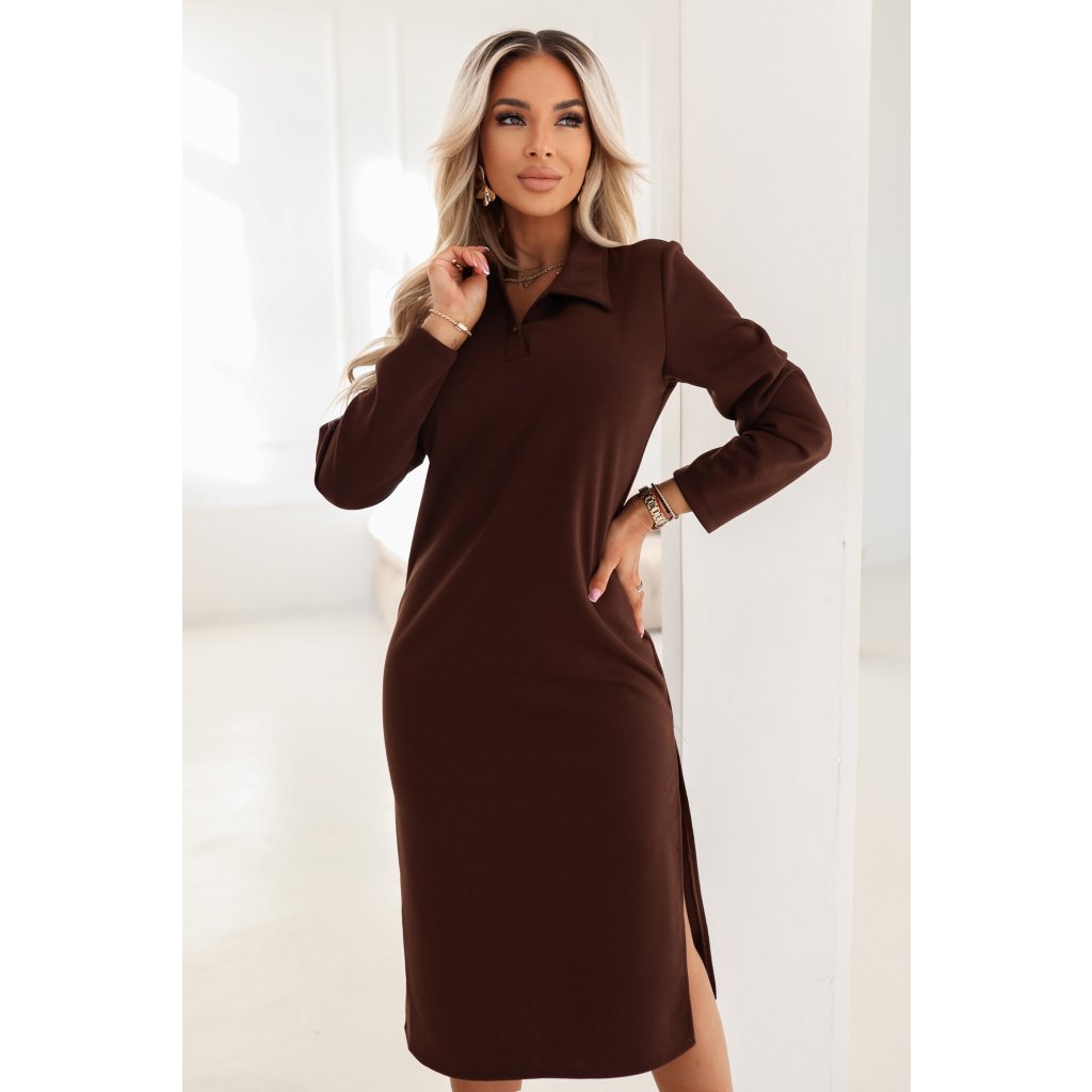 Hnědé midi šaty s límečkem a rozparkem - Numoco Basic (evropská výroba)