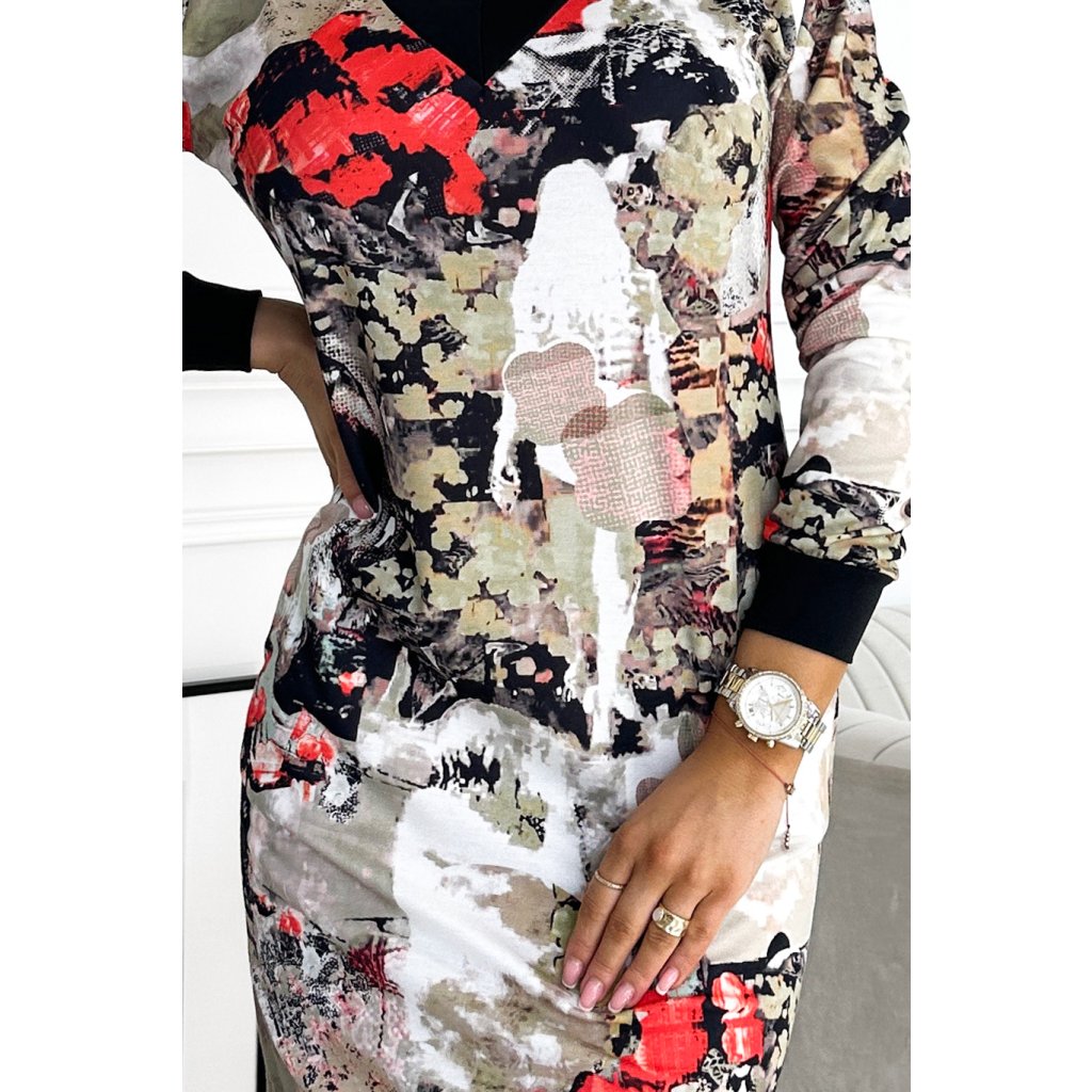 Elvira - pohodlné šaty s dlouhým rukávem a výstřihem - barevný vzor. Polský výrobek. Vyrobeno z elastického materiálu příjemného na dotek. Značka Numoco.