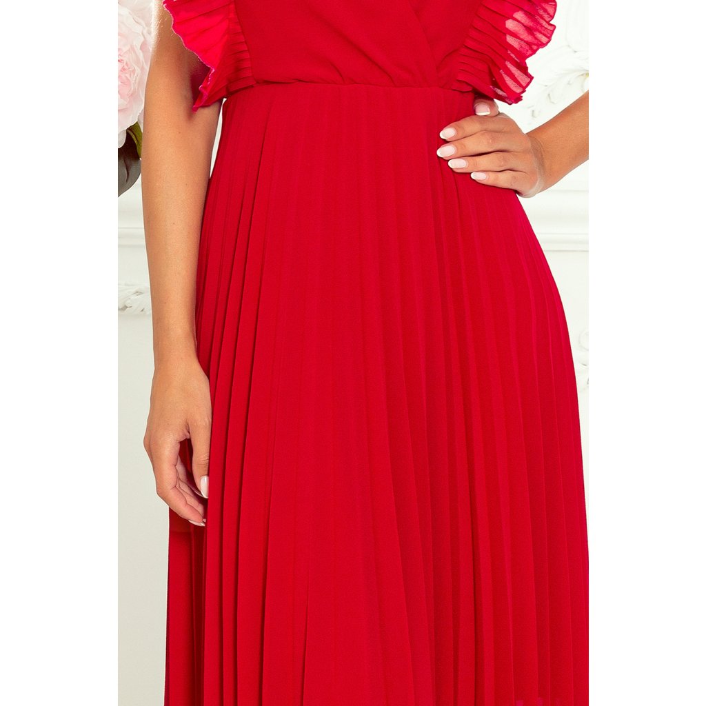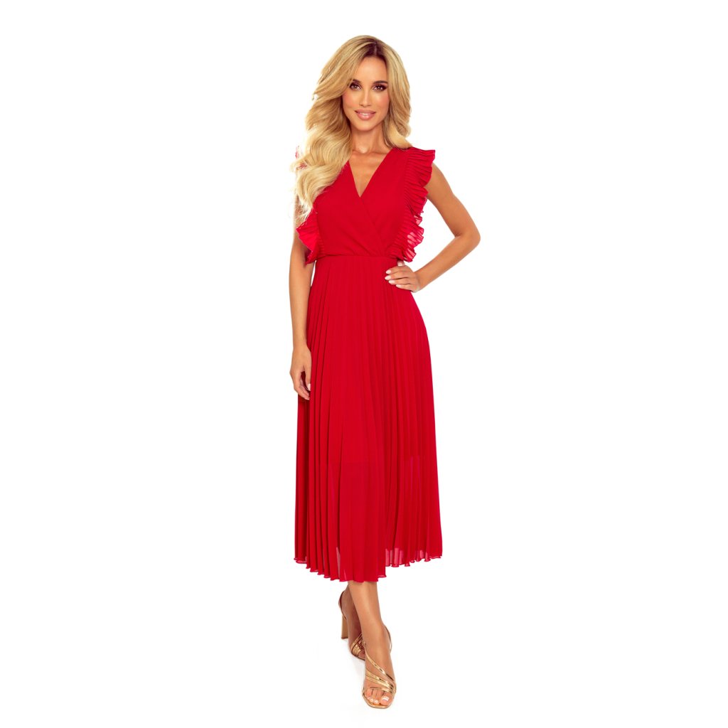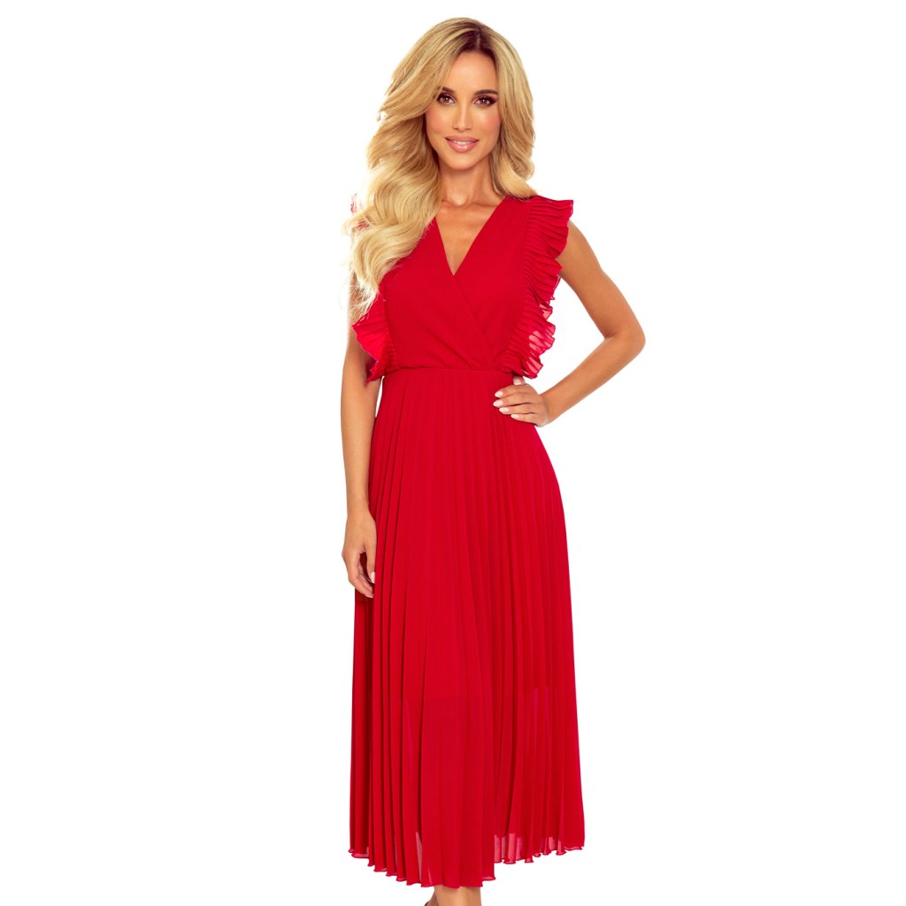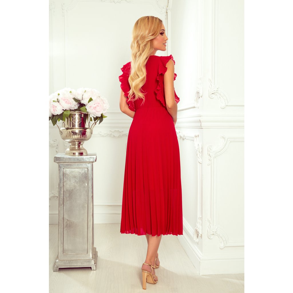 Numoco EMILY Plisované šaty s volánky a výstřihem - Červené 315-3