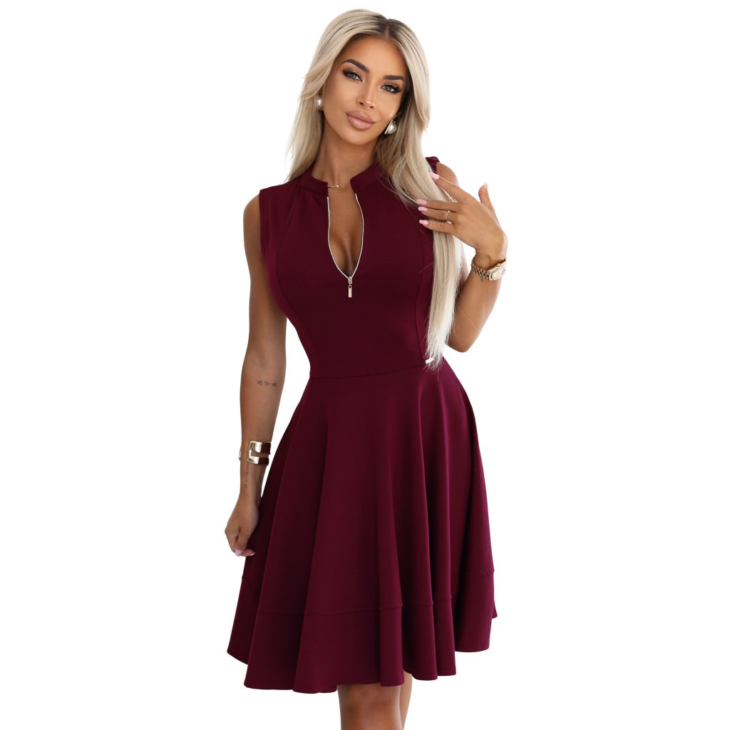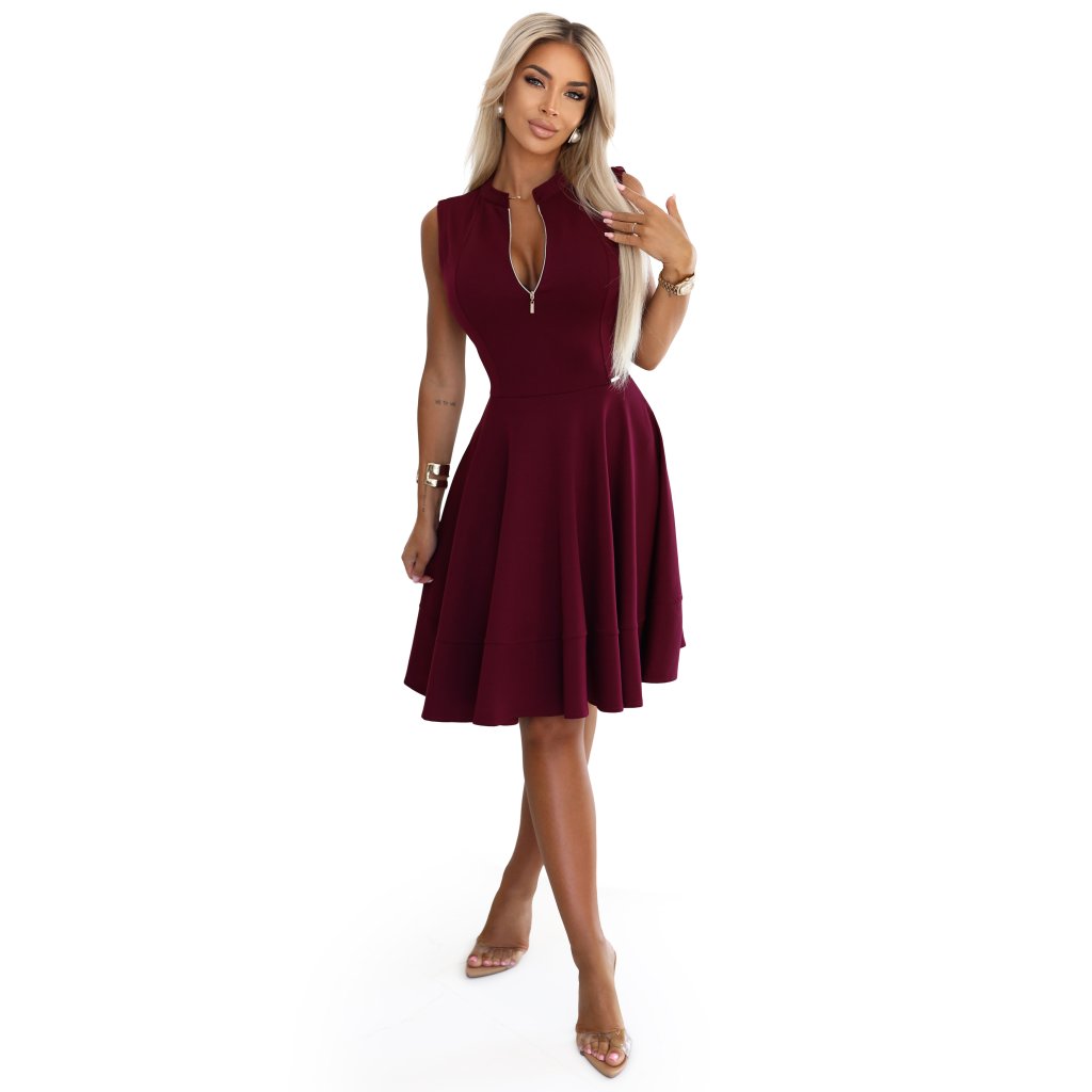 Elegantní vínové šaty bez rukávů s ozdobným zipem a rozšířenou sukní. Lichotí postavě a kombinují moderní styl s klasickou elegancí. Ideální pro zvláštní příležitosti. Značka: numoco. Vyrobeno v Polsku.