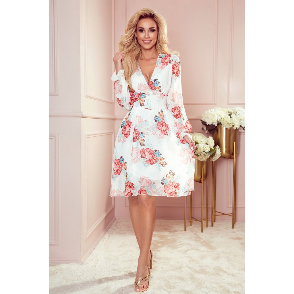 Šifonové šaty FRANCES s dlouhými rukávy a výstřihem. Slézový vzor na bílém pozadí. Značka Numoco. Polská výroba.