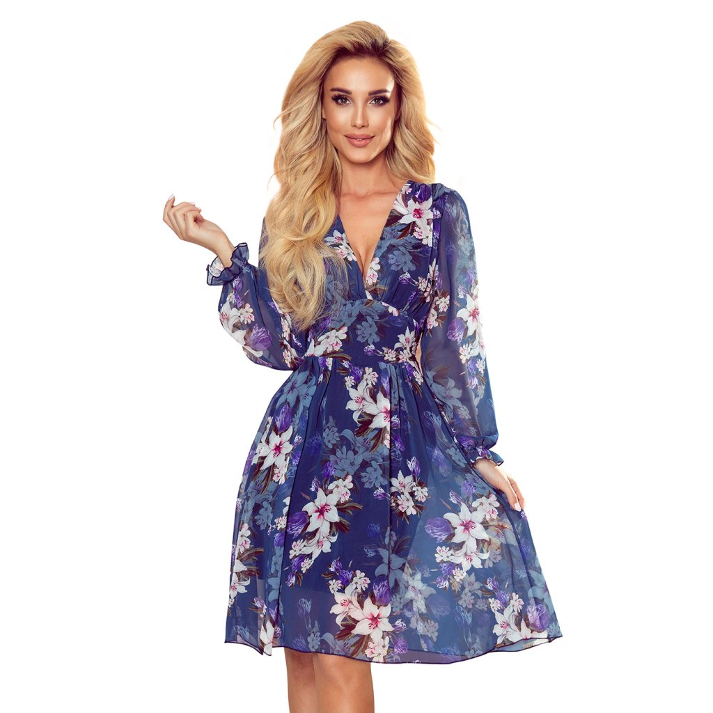 Šifonové šaty FRANCES s dlouhými rukávy a výstřihem. Vzor s květinami na tmavě modrém pozadí. Značka Numoco. Polská výroba.