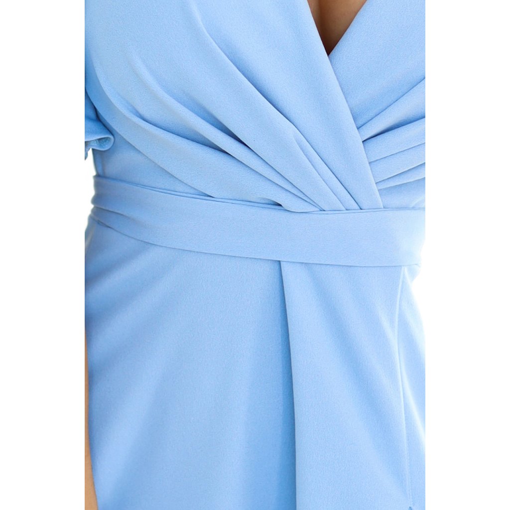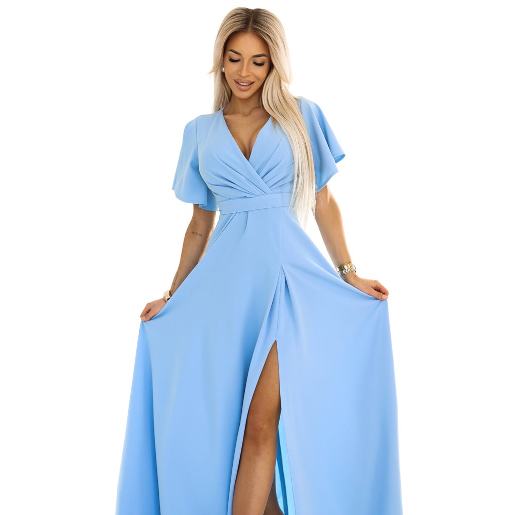 Numoco JENNIFER dlouhé šaty s rozparkem na nohavicích, rukávem a výstřihem - světle modré 581-3