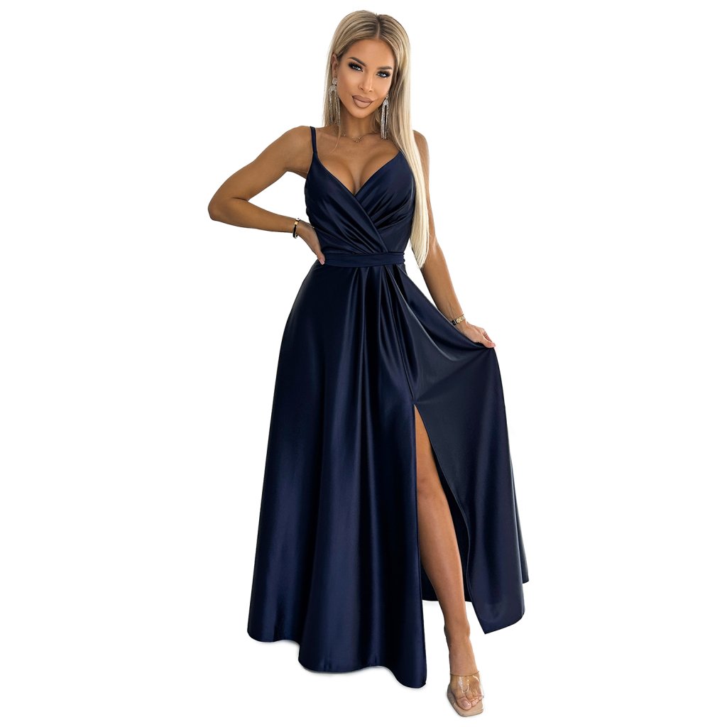 Numoco JULIET elegantní dlouhé saténové šaty s výstřihem - tmavě modrá 512-2