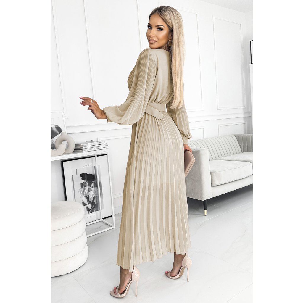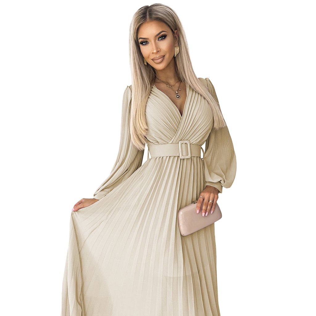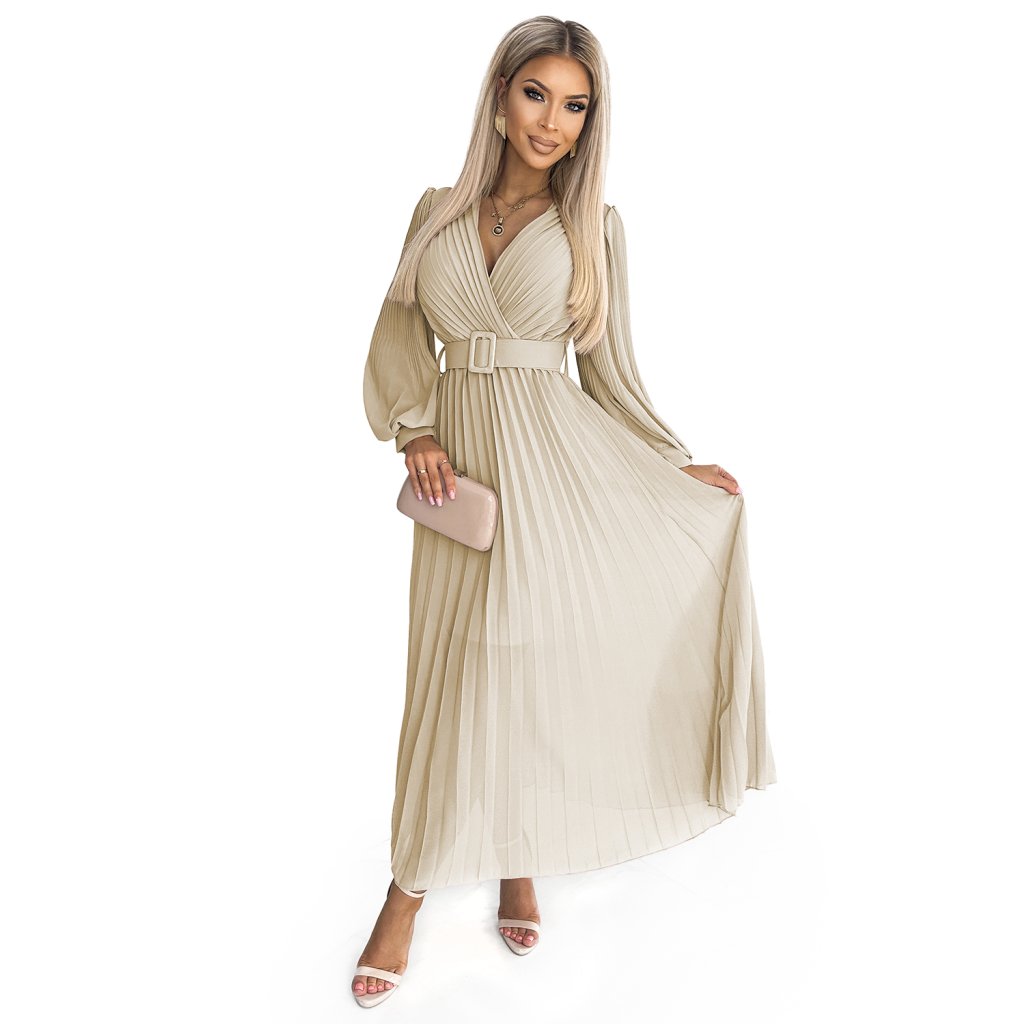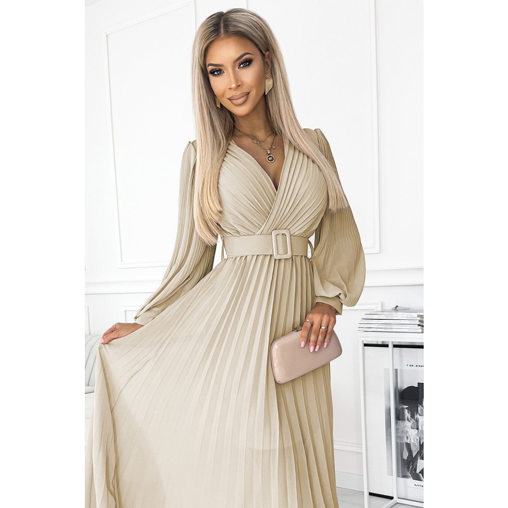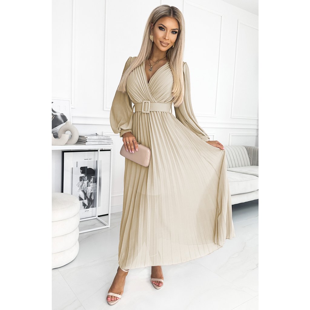 Klára - řasené šifonové šaty s výstřihem, dlouhým rukávem a páskem. Řasení na výstřihu a rukávu dodává šatům eleganci. Barva béžová. Značka Numoco.