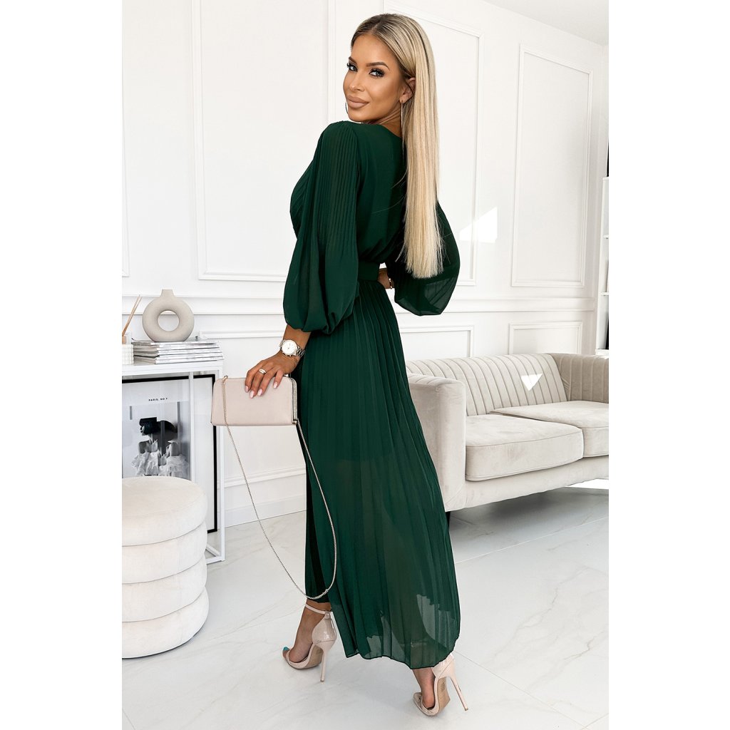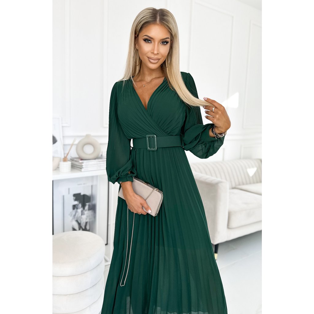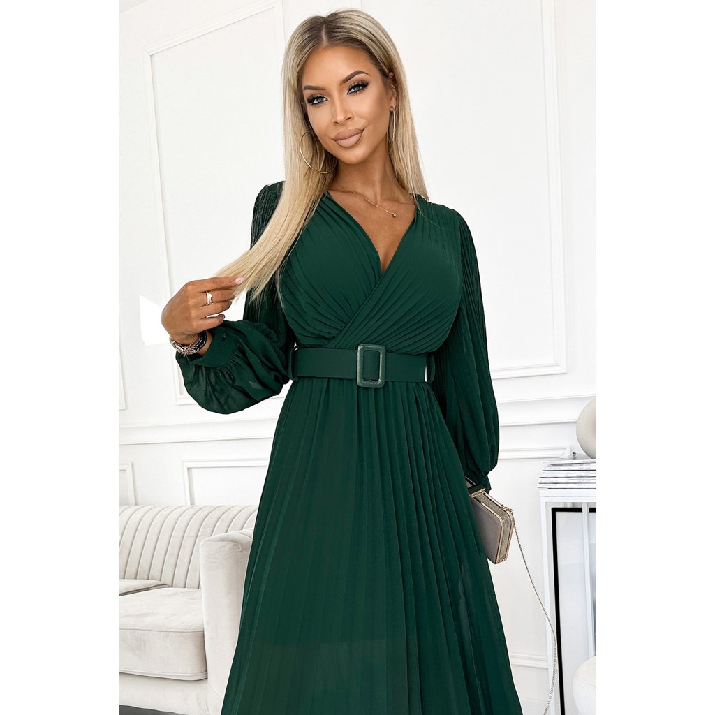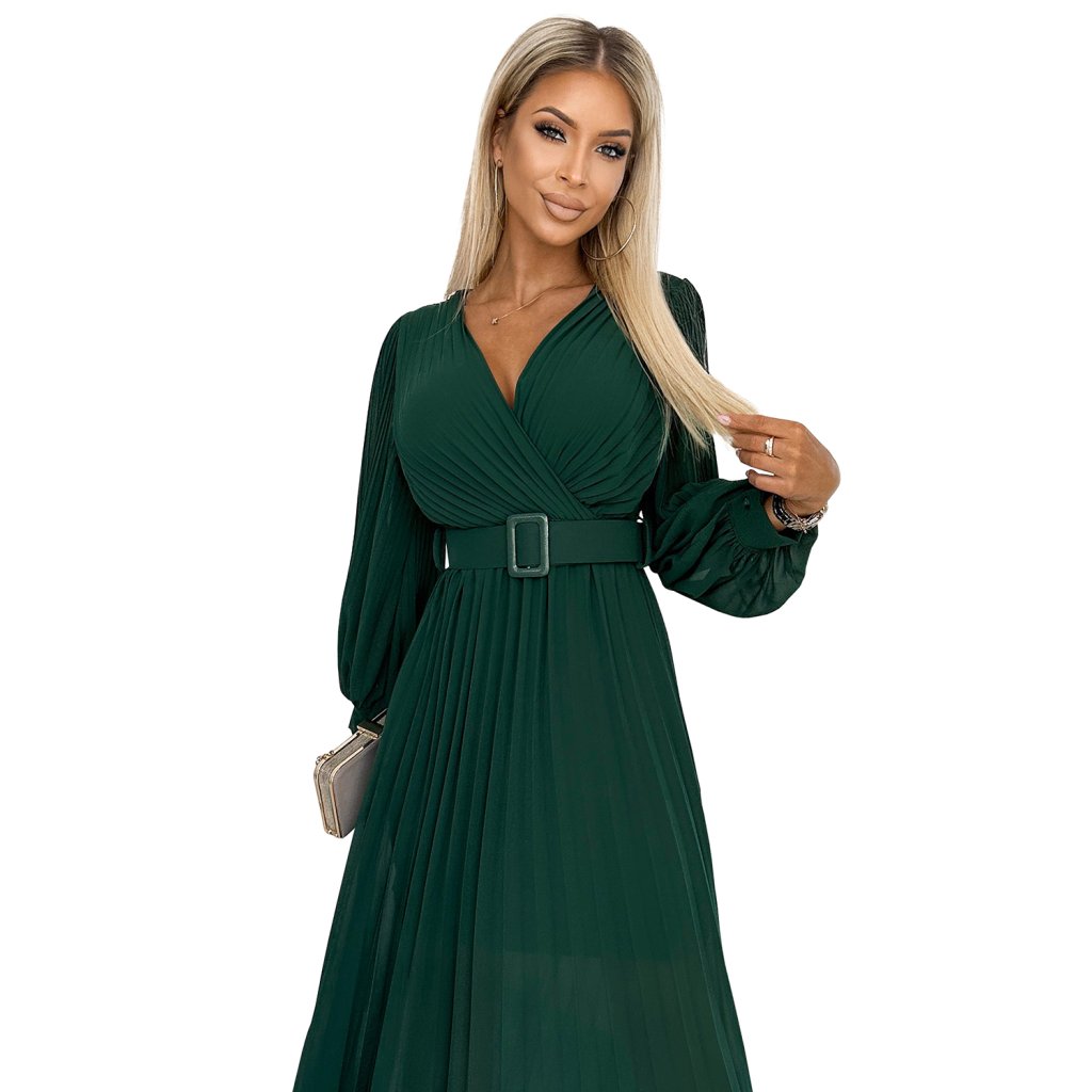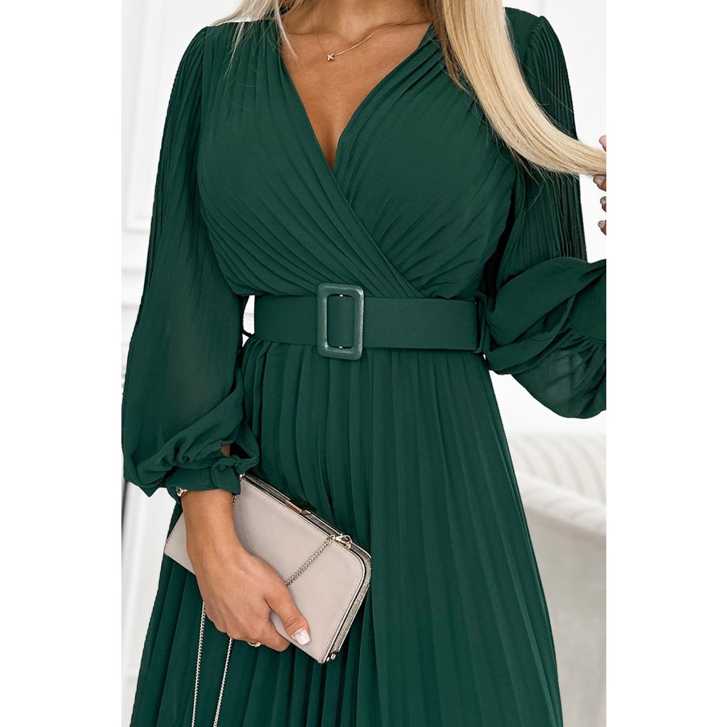 Klára - řasené šifonové šaty s výstřihem, dlouhým rukávem a páskem. Řasení na výstřihu a rukávu dodává šatům eleganci. Barva: lahvově zelená. Značka Numoco.