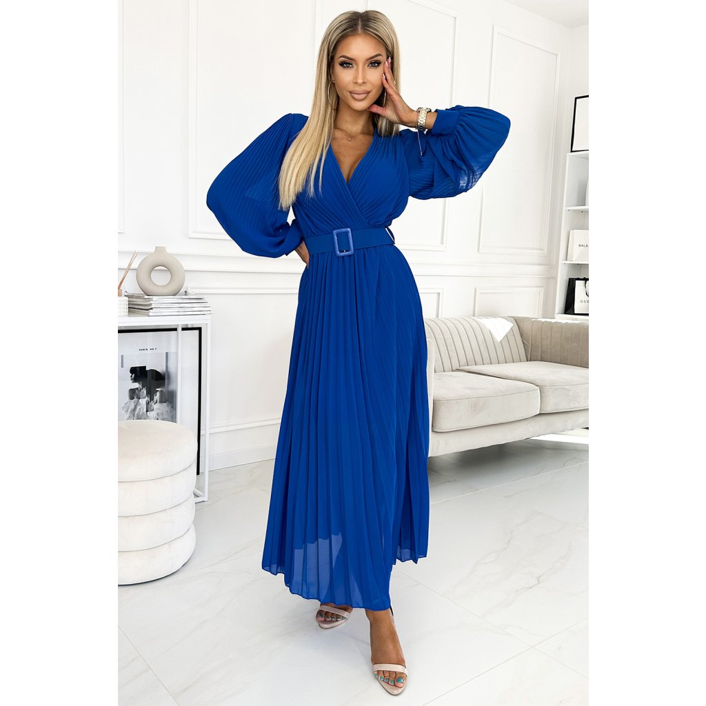 Klára - řasené šifonové šaty s výstřihem, dlouhým rukávem a páskem. Řasení na výstřihu a rukávu dodává šatům eleganci. Barva: modrá. Značka Numoco.