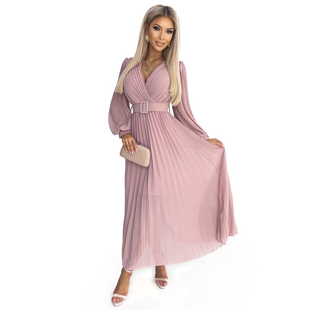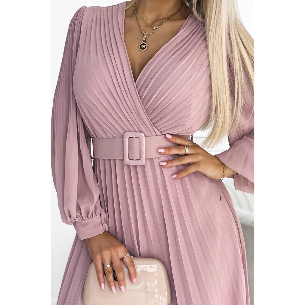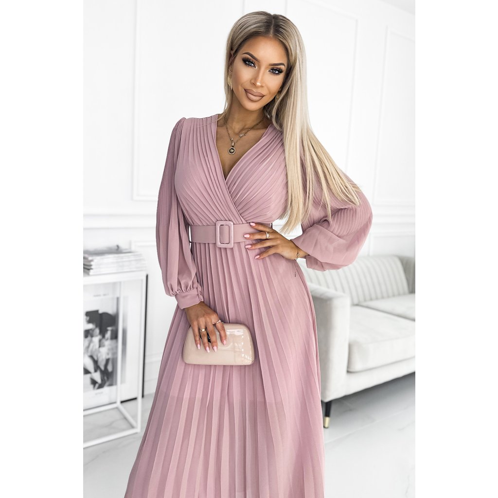Klára - řasené šifonové šaty s výstřihem, dlouhým rukávem a páskem. Řasení na výstřihu a rukávu dodává šatům eleganci. Barva: pudrově růžová. Značka Numoco.