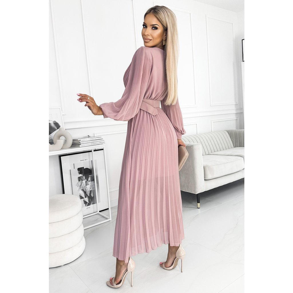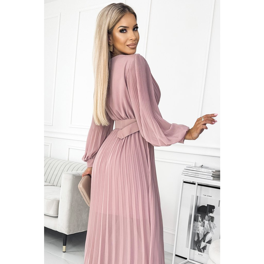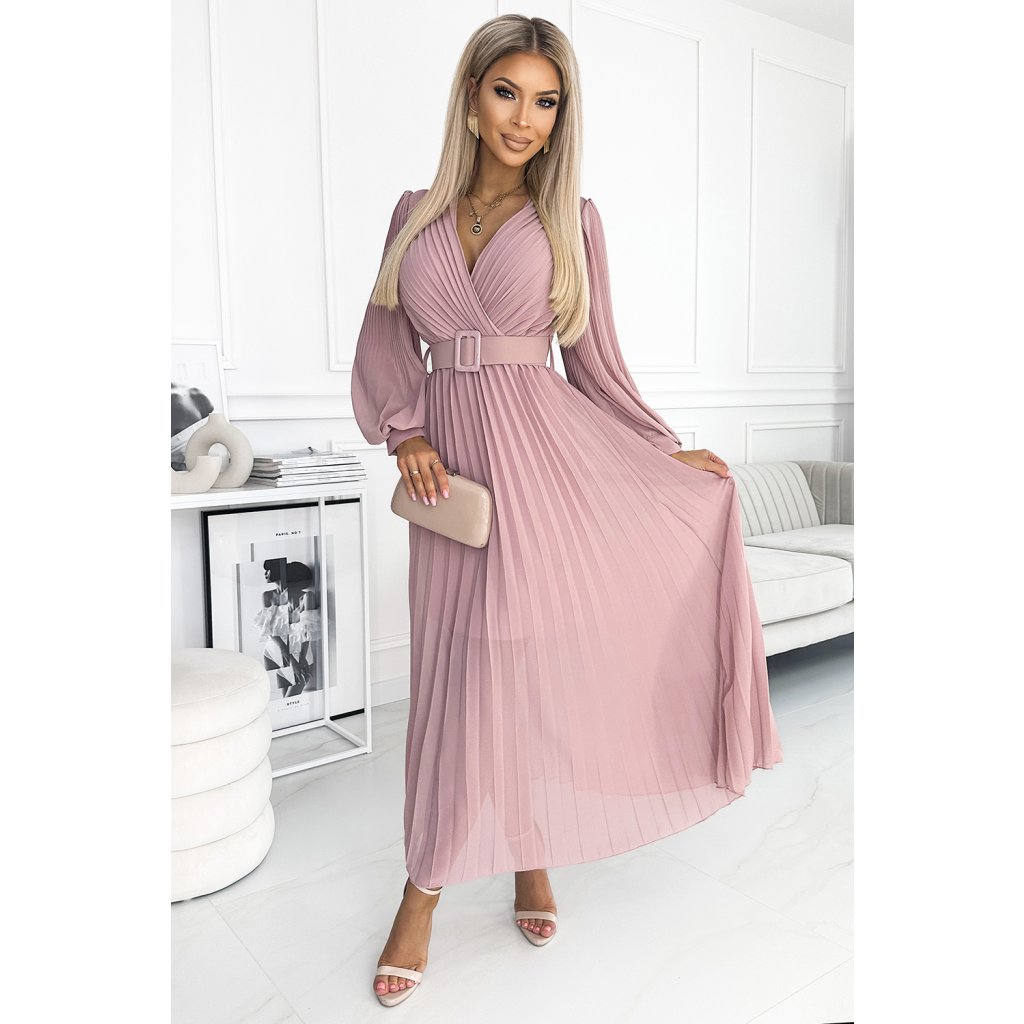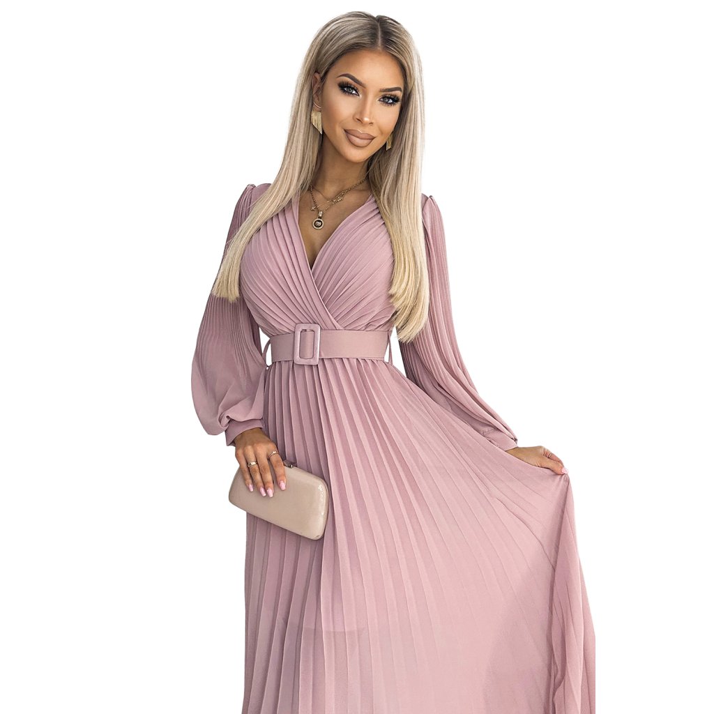 Klára - řasené šifonové šaty s výstřihem, dlouhým rukávem a páskem. Řasení na výstřihu a rukávu dodává šatům eleganci. Barva: pudrově růžová. Značka Numoco.