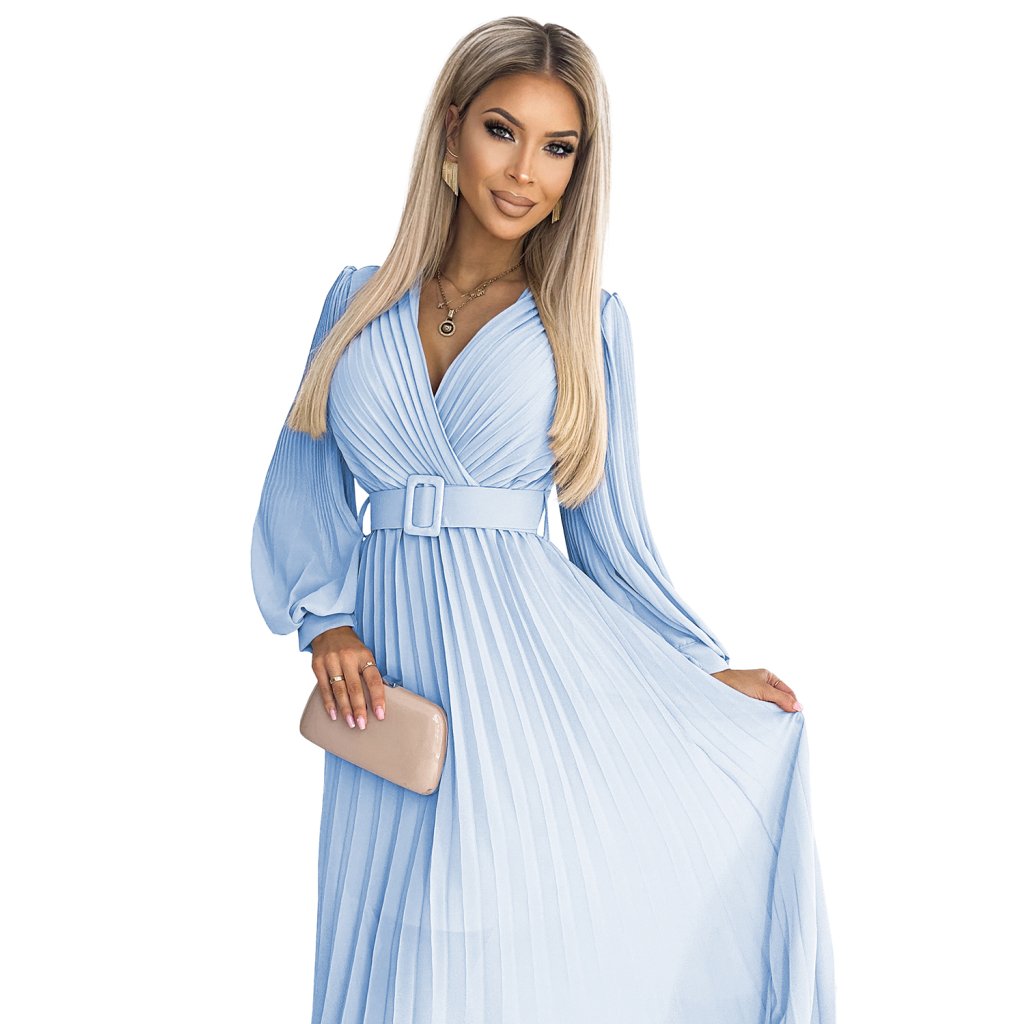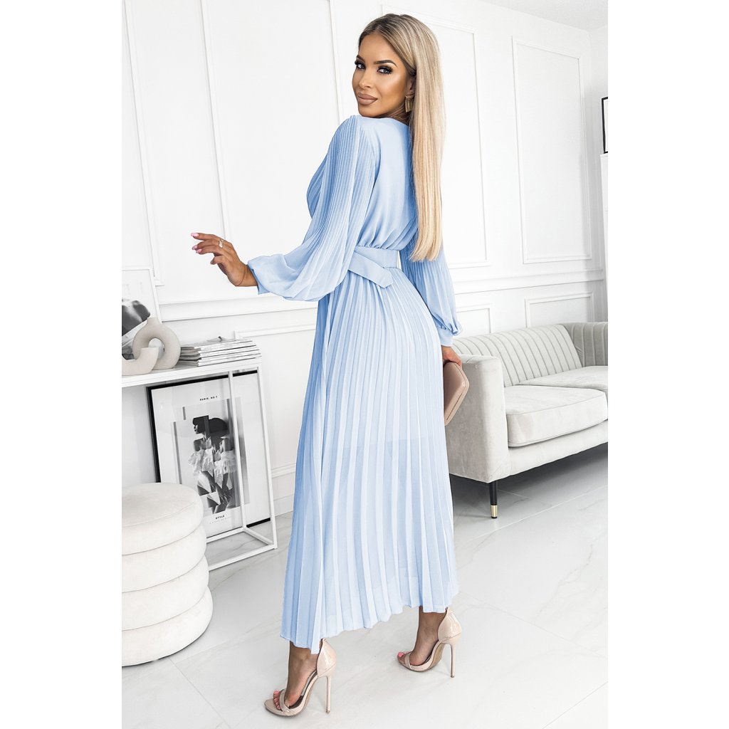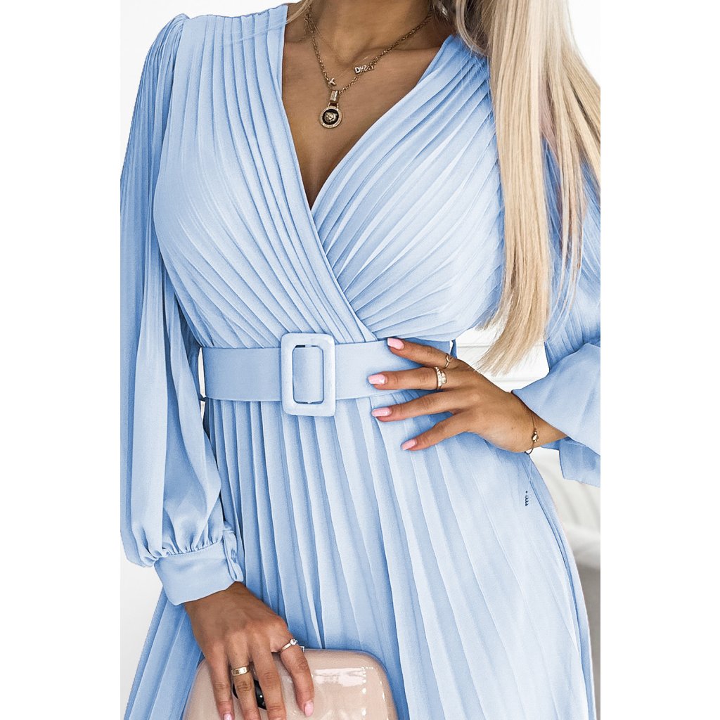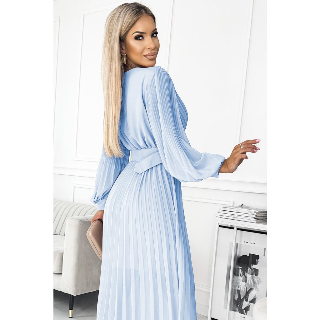 Numoco KLARA řasené šaty s páskem a výstřihem - světle modrá barva 414-10