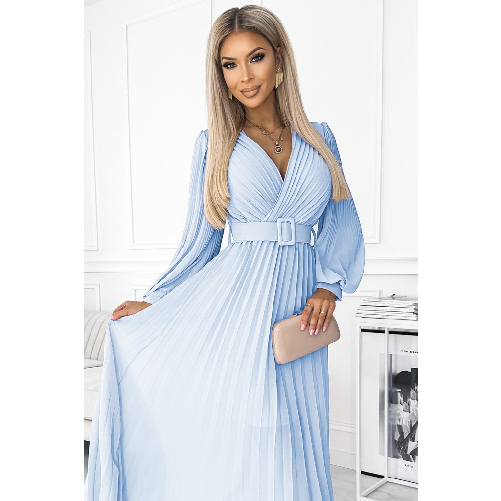 Klára - řasené šifonové šaty s výstřihem, dlouhým rukávem a páskem. Řasení na výstřihu a rukávu dodává šatům eleganci. Světle modrá barva. Značka Numoco basic.