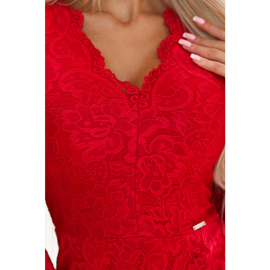 Krajkové šaty Numoco jsou kvintesencí klasické elegance. Vyrobeno v intenzivní červené barvě, má výstřih a dlouhé rukávy, které mu dodávají eleganci a jemnost. Perfektní pro zvláštní příležitosti, zdůrazňuje ženský styl a nadčasový charakter. Polský výrobek vytvořený s důrazem na každý detail.