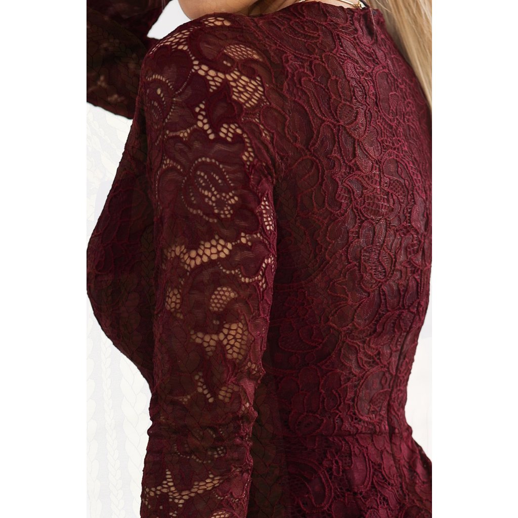 Numoco Krajkové šaty s dlouhými rukávy a výstřihem - tmavě bordó 170-14