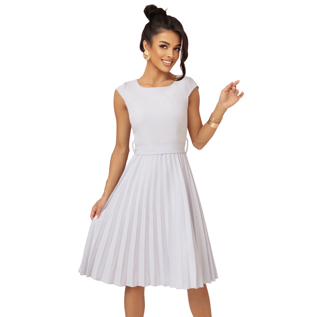 Elegantní skládané midi šaty od Numoco. Klasický střih, krátké rukávy a zavazování v pase. Ideální na svatby, svaté přijímání a jiné oslavy. Polský výrobek.