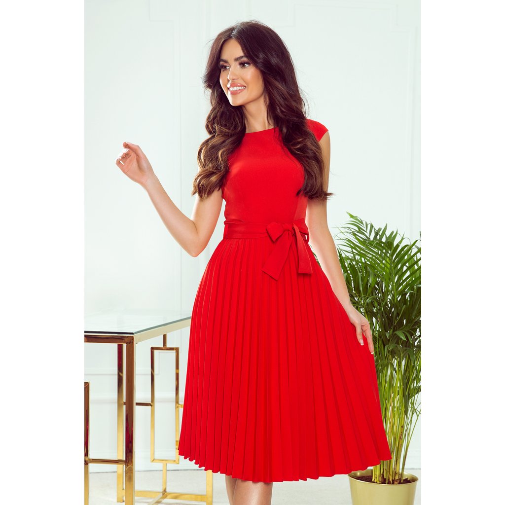 Lila - plisované šaty s krátkým rukávem a opasek. Upevněny vzadu s krytým zipem. Červená barva. Značka Numoco. Polská produkce.