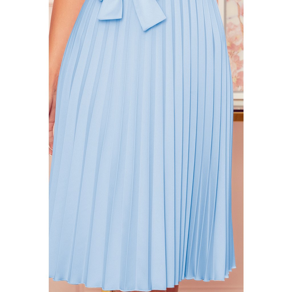 Lila - plisované šaty s krátkým rukávem a opasek. Upevněny vzadu s krytým zipem. Barva světlé modrá. Značka Numoco. Polská produkce.