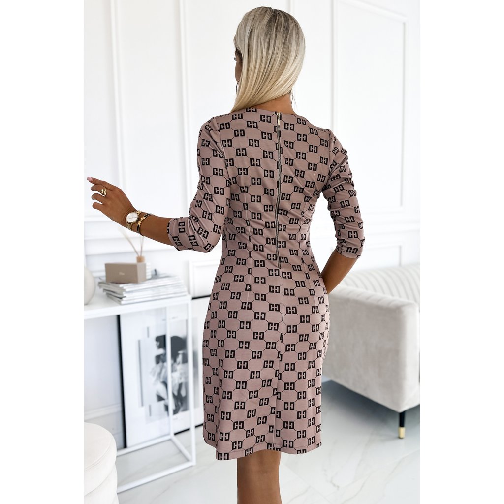 MARY - klasické šaty se zlatými zipy, 3/4 rukávy a trapézovou sukní. Vyrobeno z na dotek příjemného elastického materiálu v béžové barvě s černým vzorem. Polský výrobek. Značka Numoco.