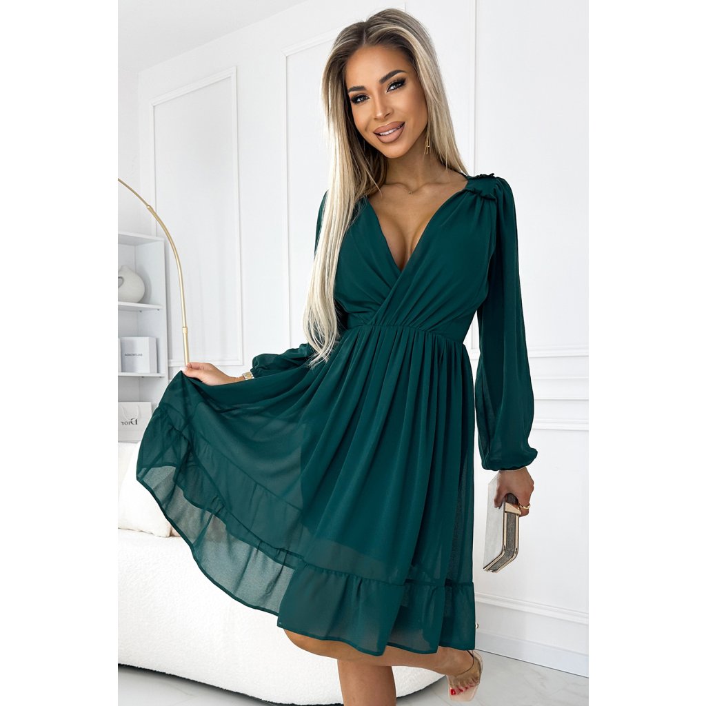 Mila - šifonové midi šaty s dlouhým rukávem a elegantně zakončeným výstřihem. Barva: lahvově zelená. Celé šaty jsou šité s podšívkou. Značka numoco. Polská výroba.