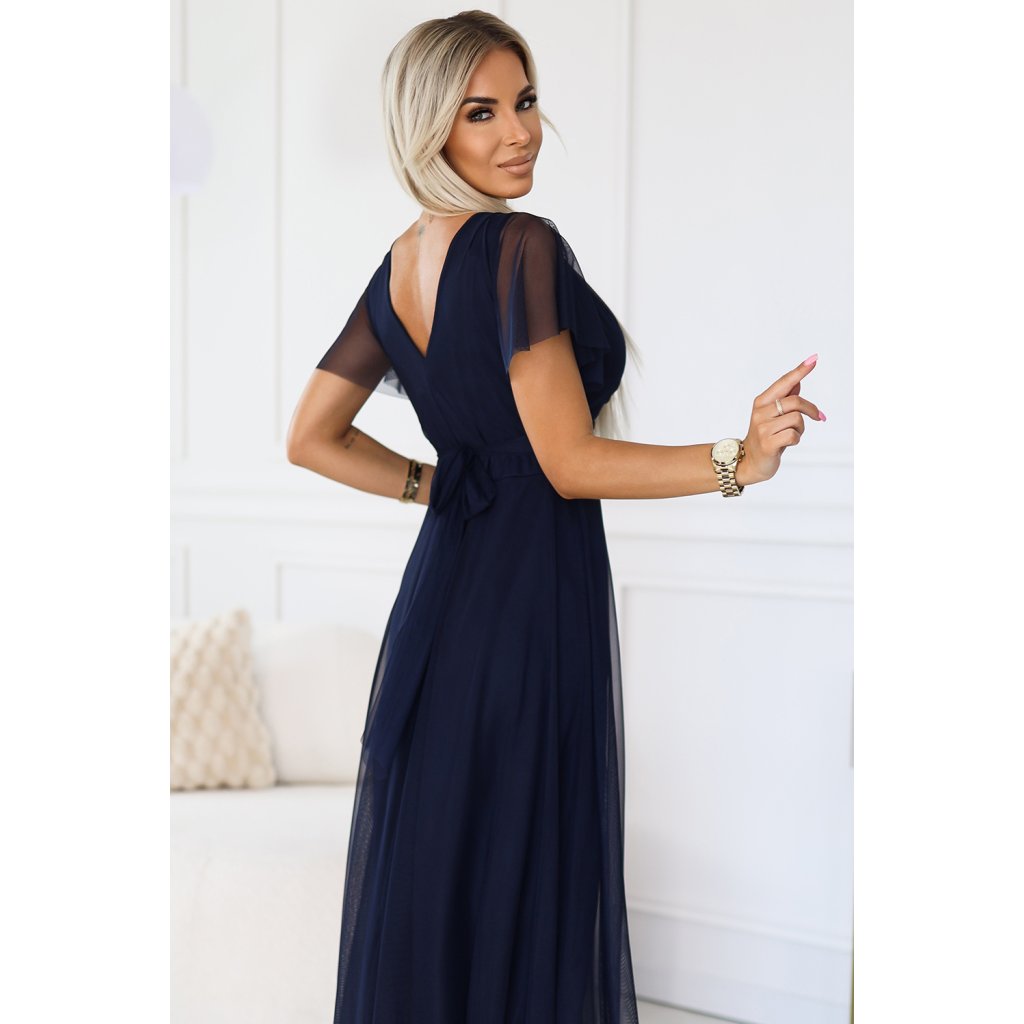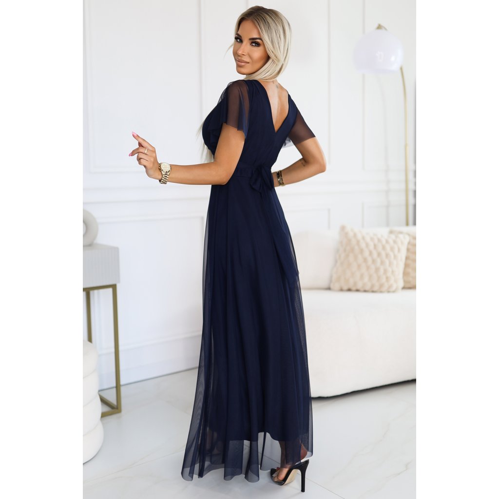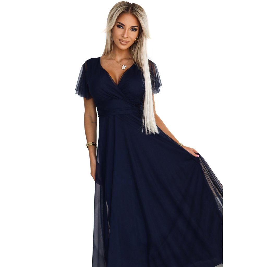 Šaty NASTIA od Numoco Basic jsou jemné dlouhé šaty s výstřihem a krátkými rukávy. Vyrobeno z lehkého, tmavě modrého tylu, který dodává vzdušnost a lehkost. Šaty mají vyztužené košíčky, které poskytují výbornou oporu, zavazování v pase decentně zvýrazňuje pas. Jedná se o jedinečnou nabídku s ženským a romantickým charakterem. Vyrábí se v Evropě a kombinuje vysokou kvalitu zpracování a elegantní design. Ideální pro večery a speciální oslavy.
