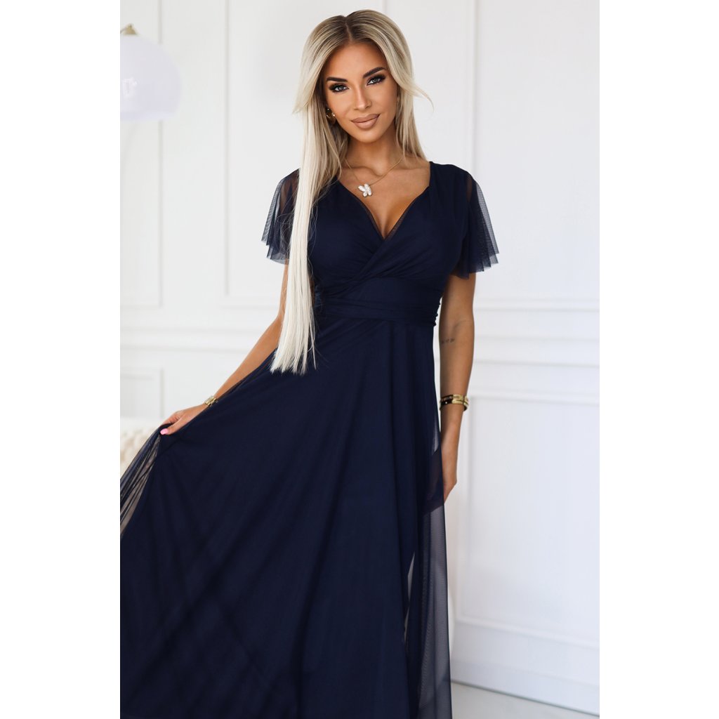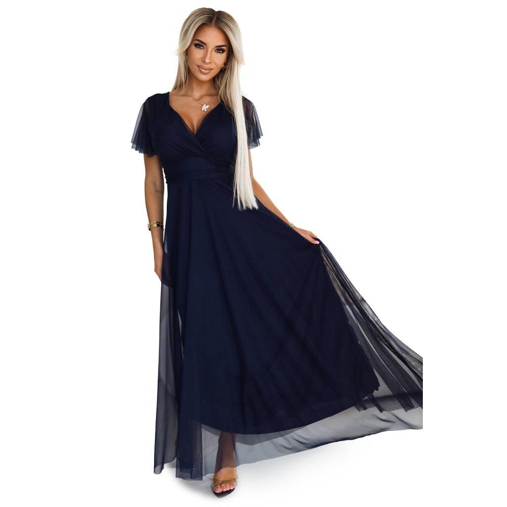Šaty NASTIA od Numoco Basic jsou jemné dlouhé šaty s výstřihem a krátkými rukávy. Vyrobeno z lehkého, tmavě modrého tylu, který dodává vzdušnost a lehkost. Šaty mají vyztužené košíčky, které poskytují výbornou oporu, zavazování v pase decentně zvýrazňuje pas. Jedná se o jedinečnou nabídku s ženským a romantickým charakterem. Vyrábí se v Evropě a kombinuje vysokou kvalitu zpracování a elegantní design. Ideální pro večery a speciální oslavy.
