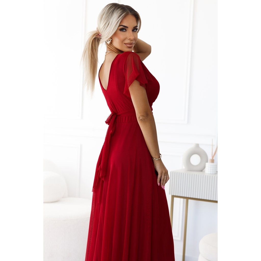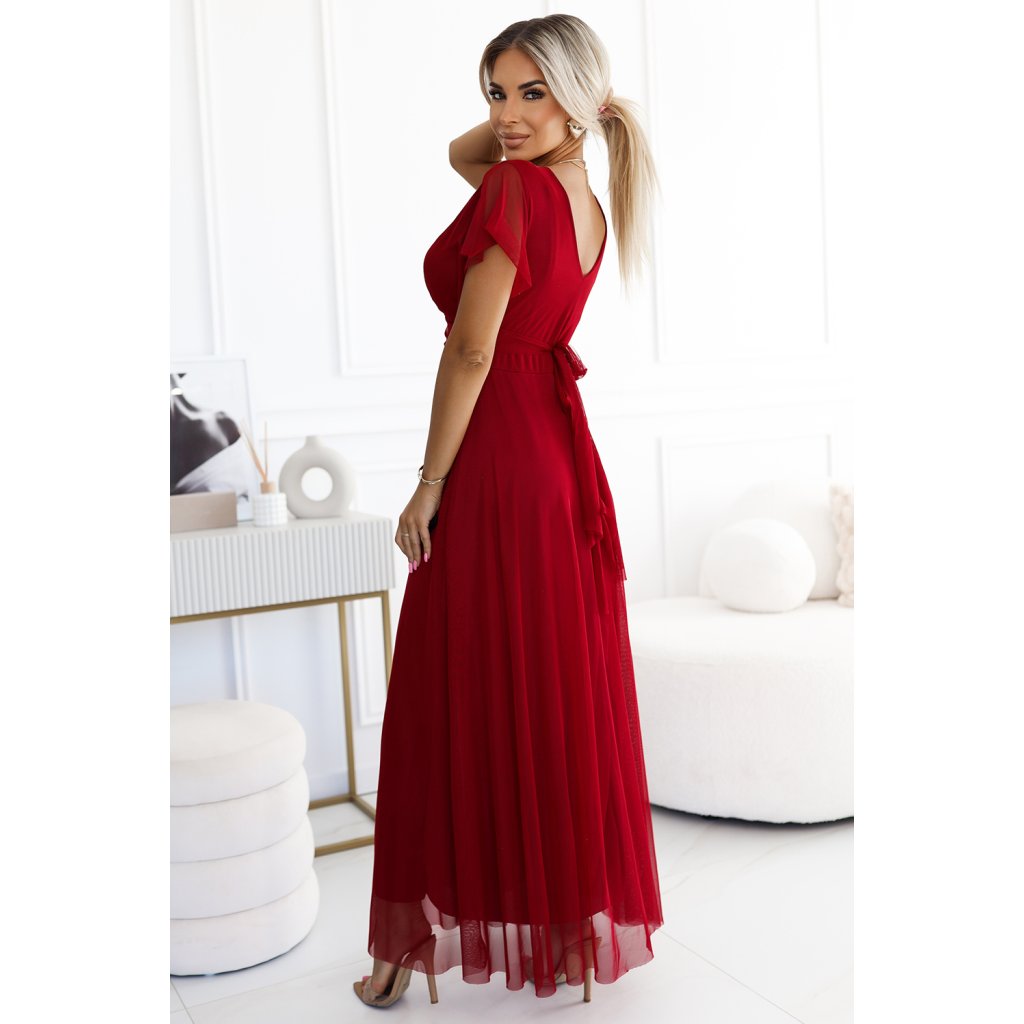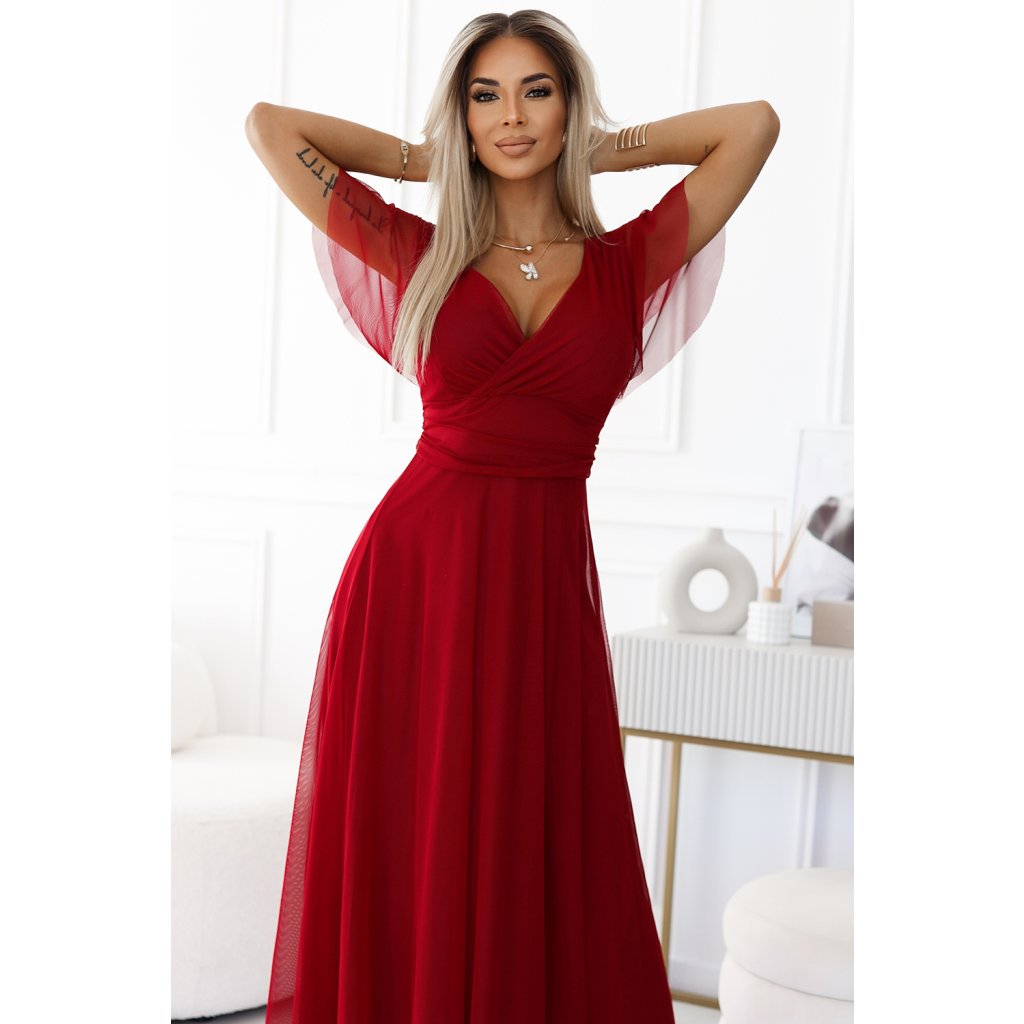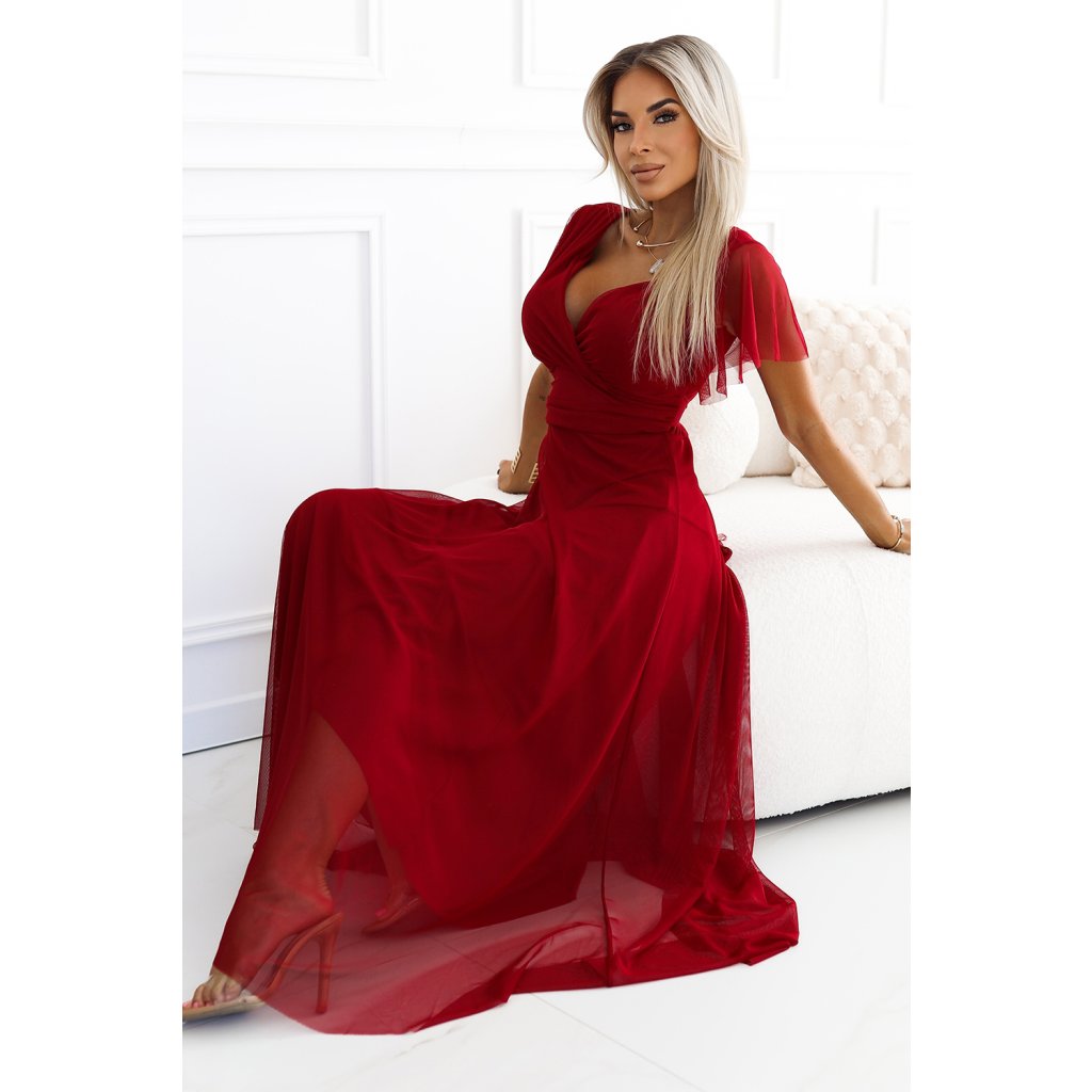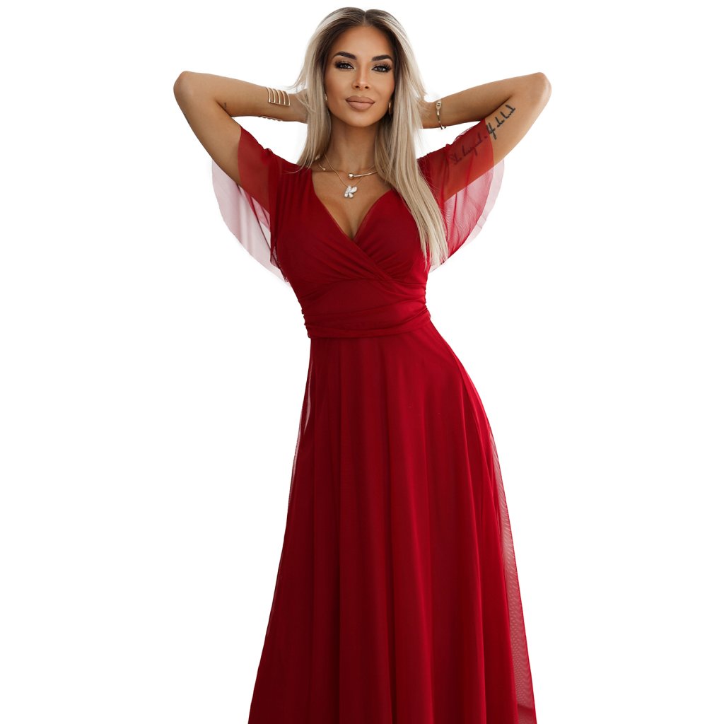 Šaty NASTIA od značky Numoco Basic jsou jemné dlouhé šaty se srdíčkovým výstřihem a krátkými rukávy. Jsou vyrobeny ze světle vínového tylu, který jim dodává vzdušnost a lehkost. Šaty mají vyztužené košíčky pro vynikající podporu, zatímco zavazování v pase jemně zvýrazňuje pas. Jedná se o jedinečný design, který působí žensky a romanticky. Šaty jsou vyrobeny v Evropě a kombinují vysokou kvalitu zpracování a elegantní design. Ideální na večerní vycházky a zvláštní příležitosti.