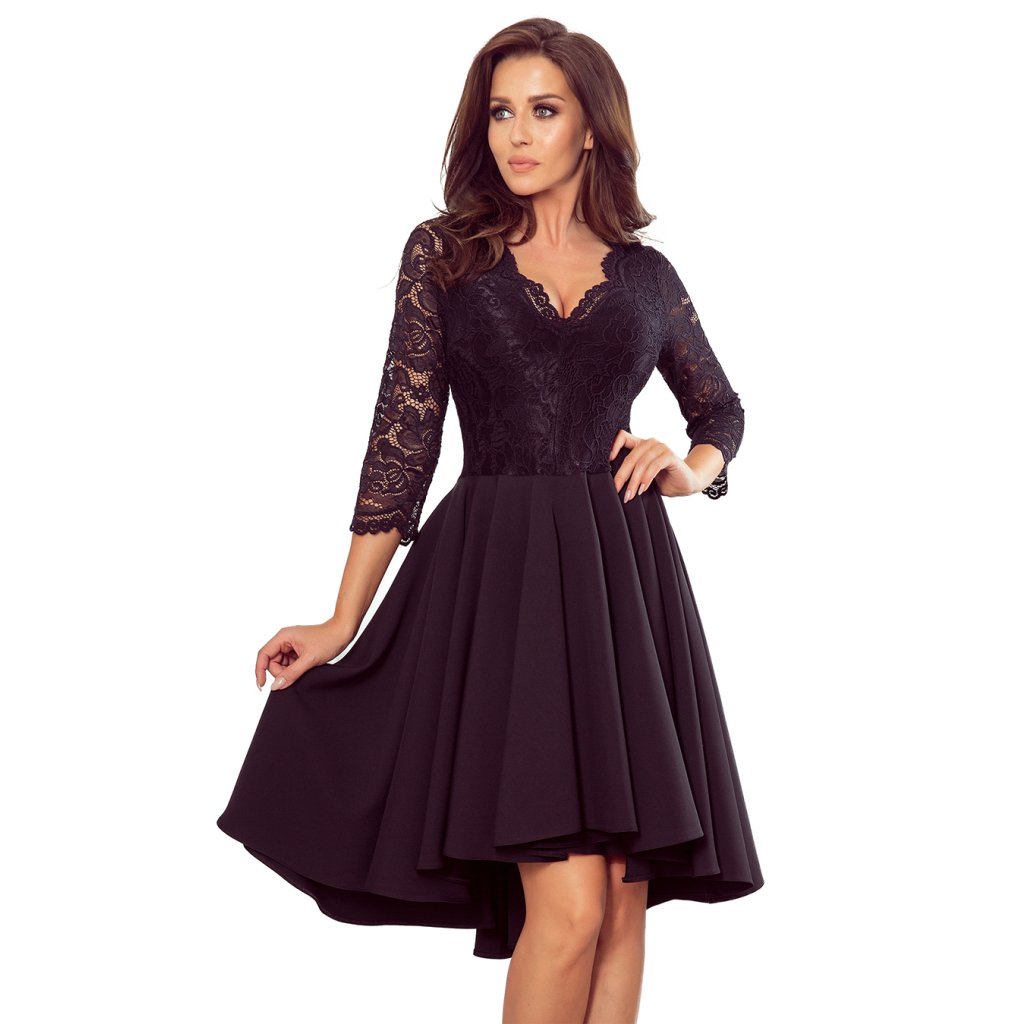 Nicolle - asymetrické exkluzivní šaty s delšími zády, 3/4 rukávy, výstřih a krajka - černé. Sukně s delším zádovým letem bude ideální pro tanec. Polská produkce. Numoco