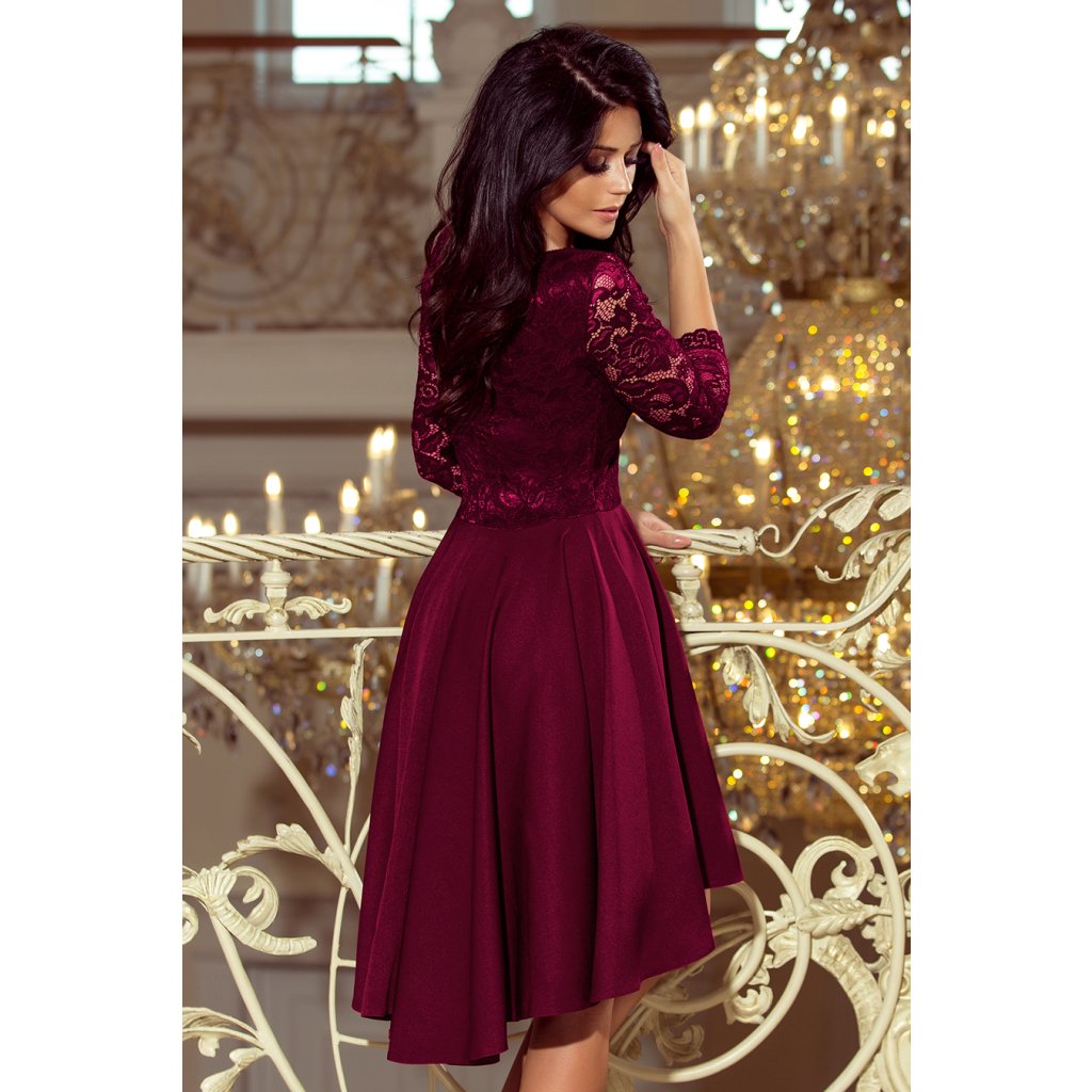 Nicolle - asymetrické exkluzivní šaty s delším zadním dílem, 3/4 rukávem, výstřihem a krajkou - švestková barva. Na tanec se bude skvěle hodit sukně s delším zadním dílem. Polská výroba. Značka Numoco.