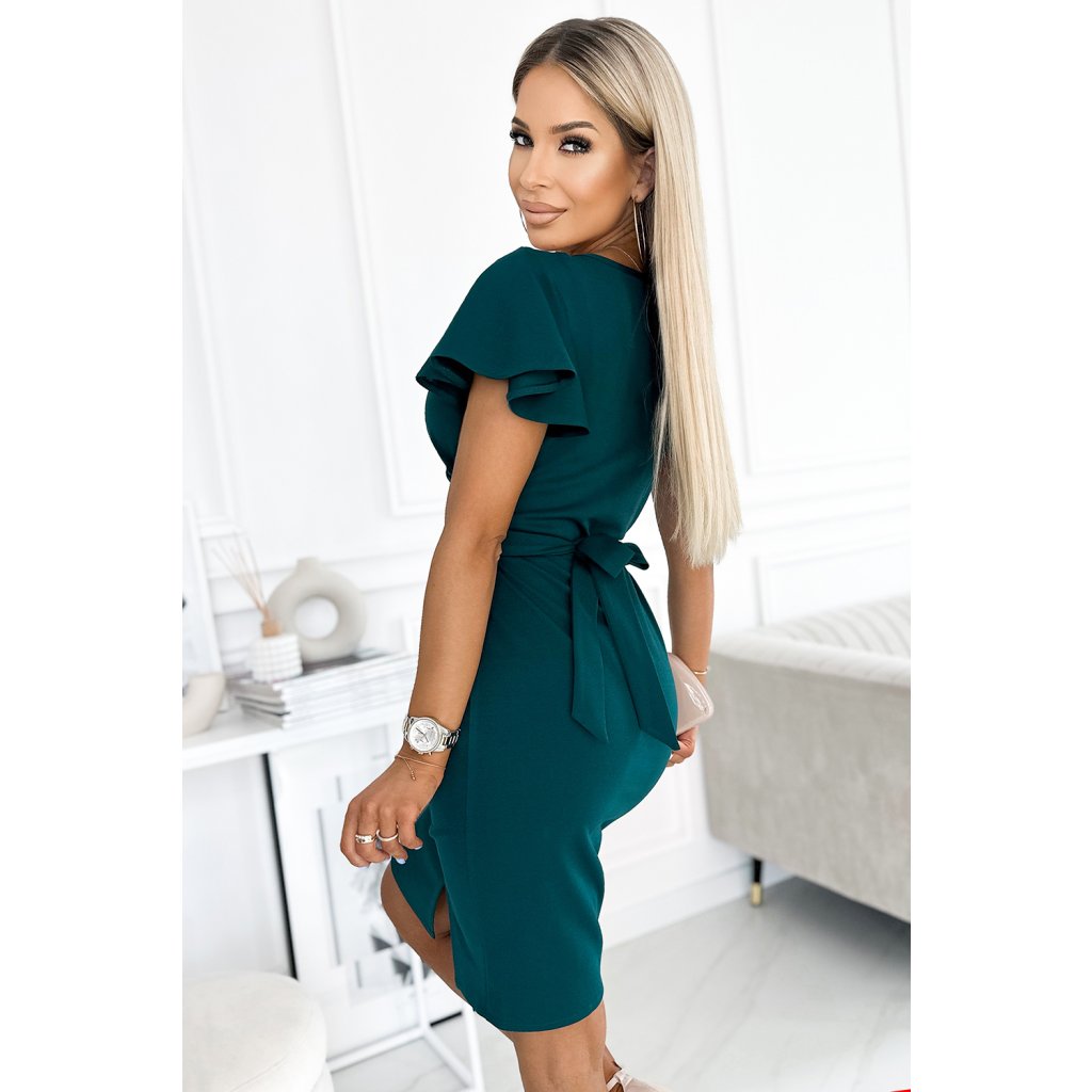 Numoco NINA šaty s psaníčkovým výstřihem, rukávem a páskem - zelené 479-1