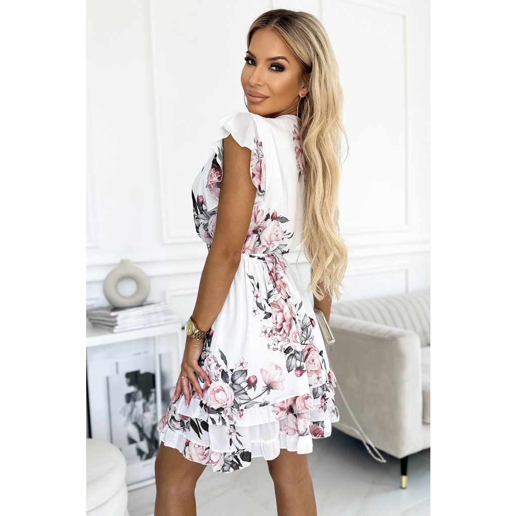 Patrizia - ženské šaty s volánky, dvojitá sukně, psaníčkový výstřih, krátké rukávy a pásek. Vyrobeno ze šifonového materiálu s podšívkou. Bezešvé vzor s růžemi na bílém pozadí. Značka Numoco. evropská produkce.