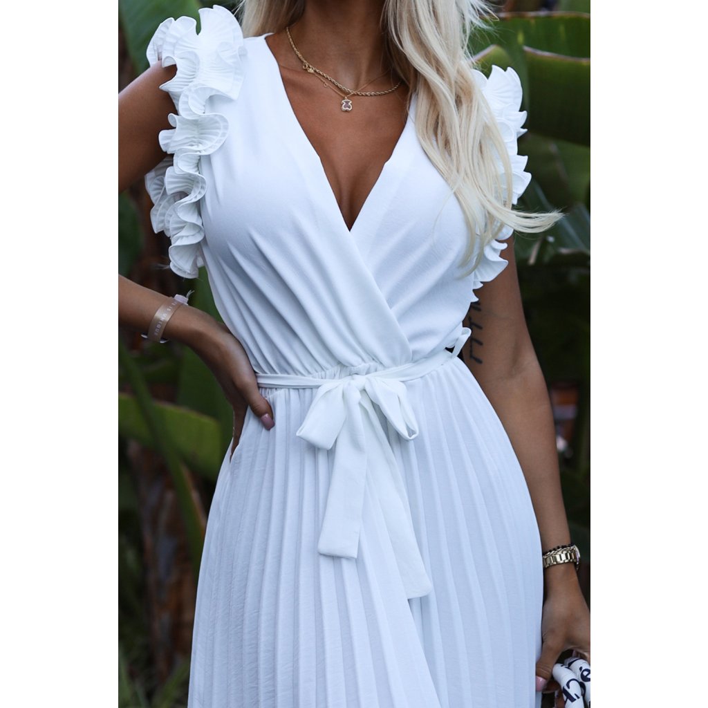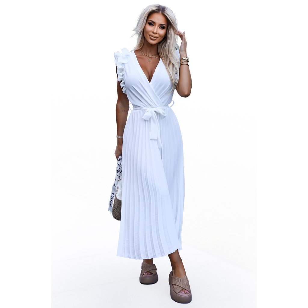 Plisované šaty s psaníčkovým výstřihem, páskem a jemnými volánky. Vyrobeno z mačkaného bílého materiálu. Perfektní šaty pro každou příležitost. Základní značka Numoco. evropská produkce.