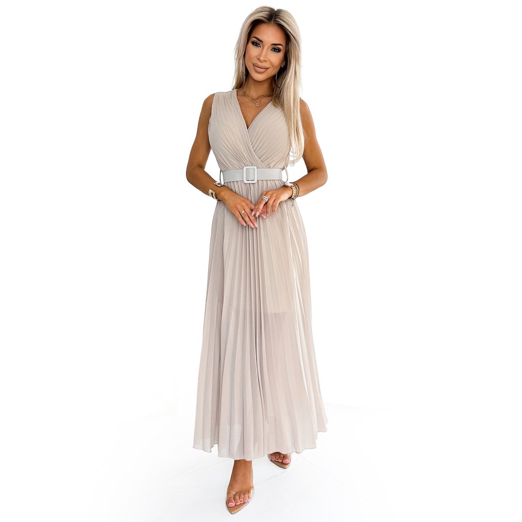 Numoco Plisované šaty s širokým páskem a výstřihem - béžové 546-1