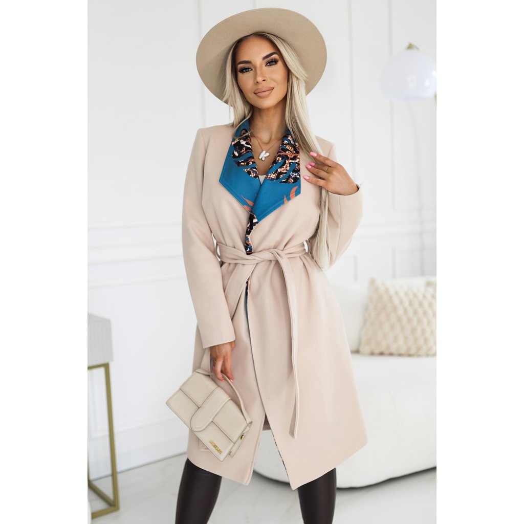 Polský béžový kabát s kravatou a stylovou vsadkou do límce