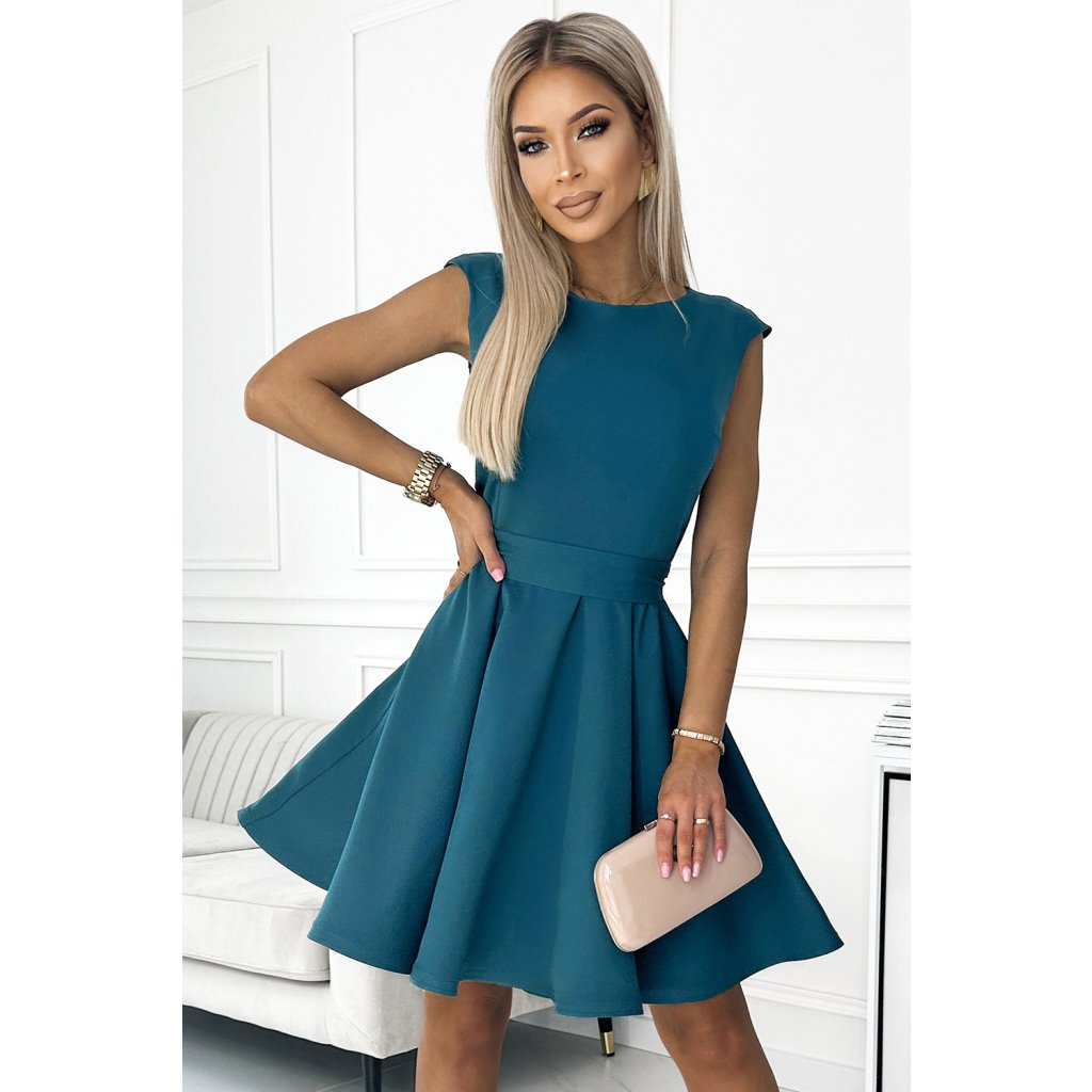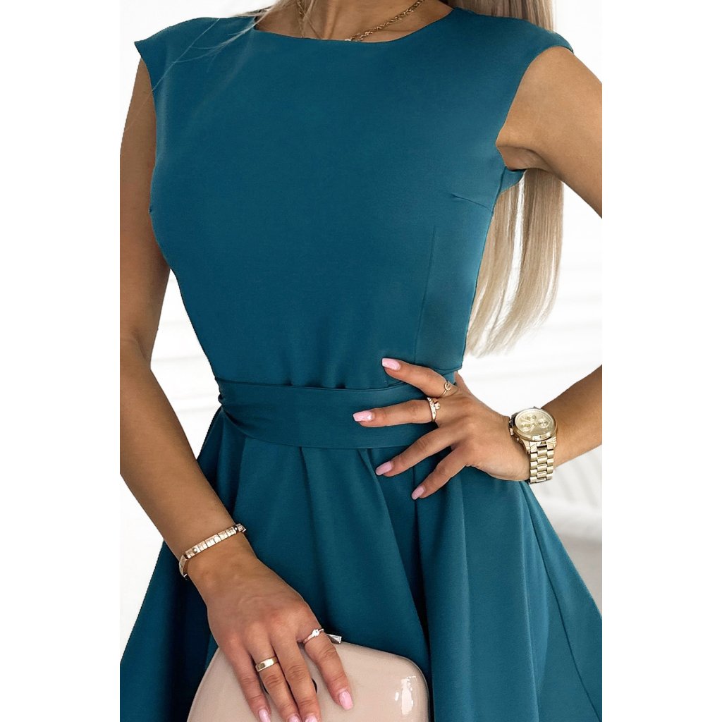 Rozevláté šaty s malými rukávy a páskem. Z hladkého materiálu v módní moře barvě. Zapínání zpět na zip. Značka Numoco. Polský výrobek.